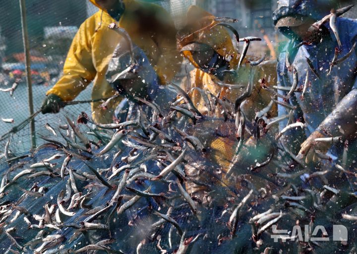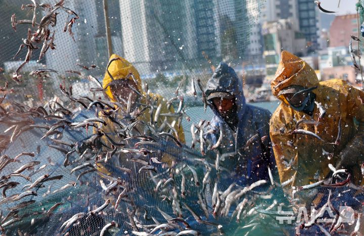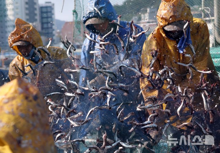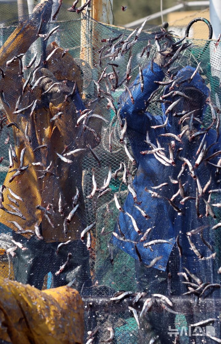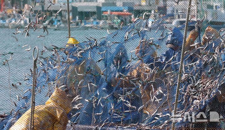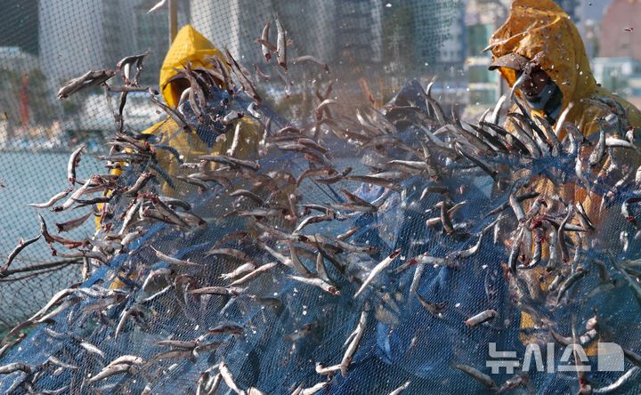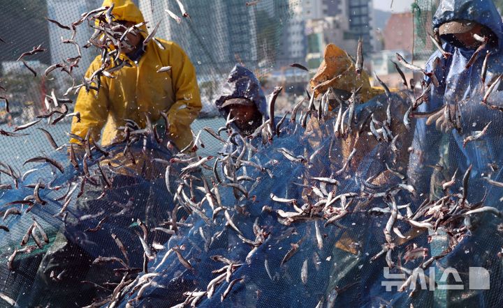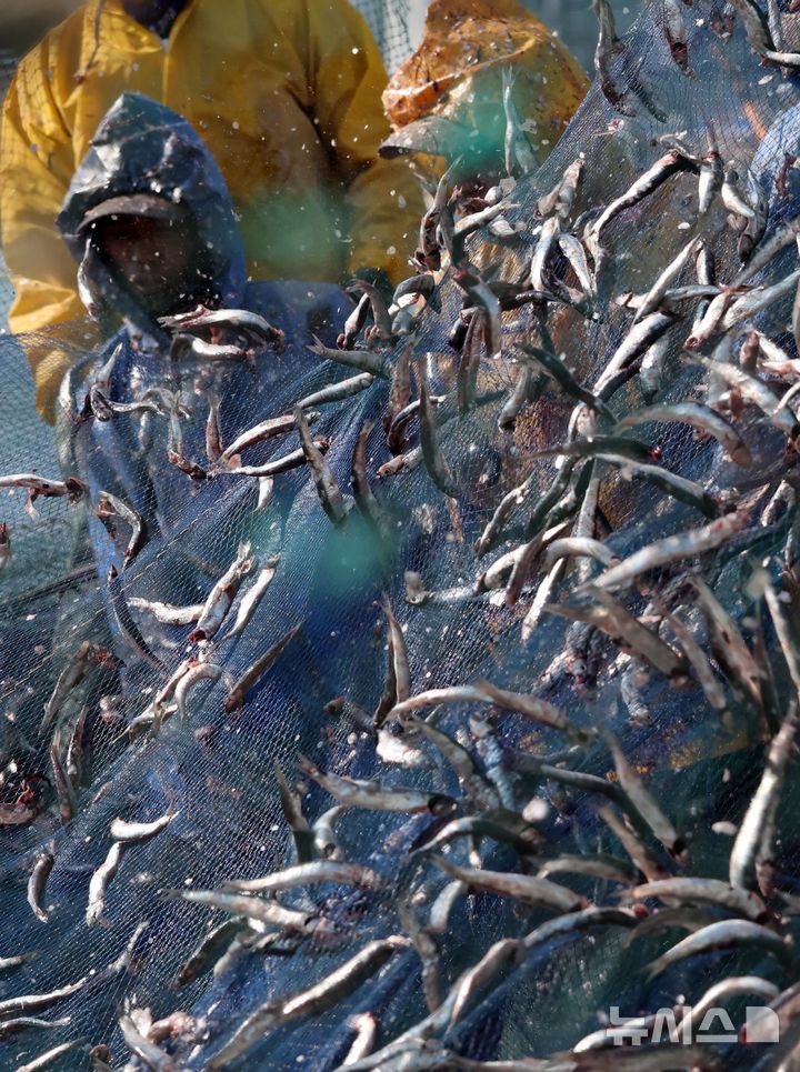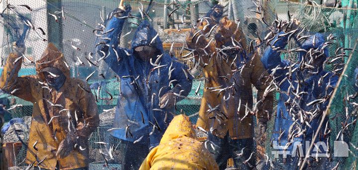 【NEWSIS】釜山市機張郡の大辺港で10日午後、漁業者と外国人労働者が、捕れたばかりのカタクチイワシを網から外している様子。春の機張イワシは体長が10-15センチで、焼き魚、刺身、塩辛などに用いられている。