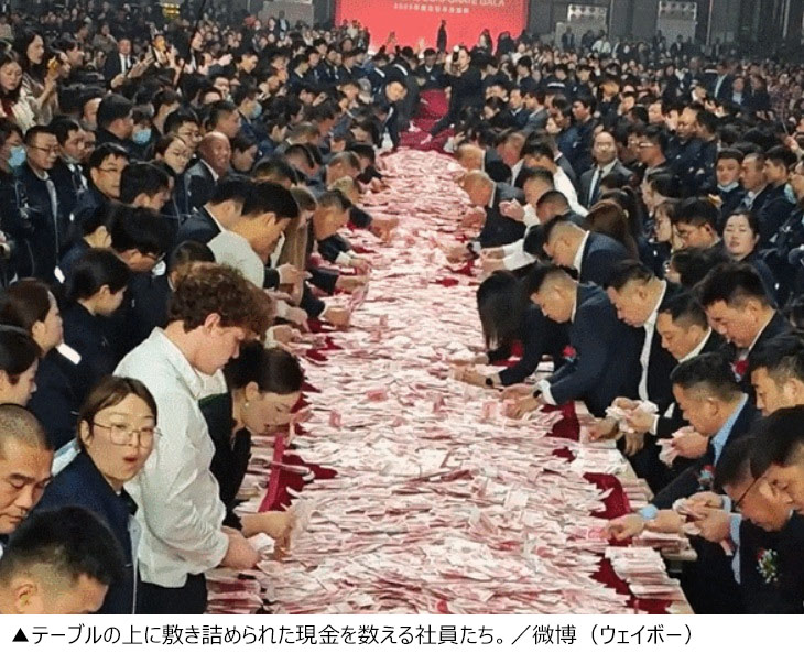 昨年末の行事で注目を集めたのはもちろん、社員に支給するためにテーブル上に敷き詰められた大量の現金だった。会場内には800個の宴会用テーブルが並べられ、その上に6000万元(約13億7000万円)以上の札束が敷き詰められた。社員たちはこのテーブルで決められた時間内に自分でお札を数え、その分の紙幣を家に持ち帰った。ある社員は10分間で9万1000元(約208万円)を数えることに成功したという。