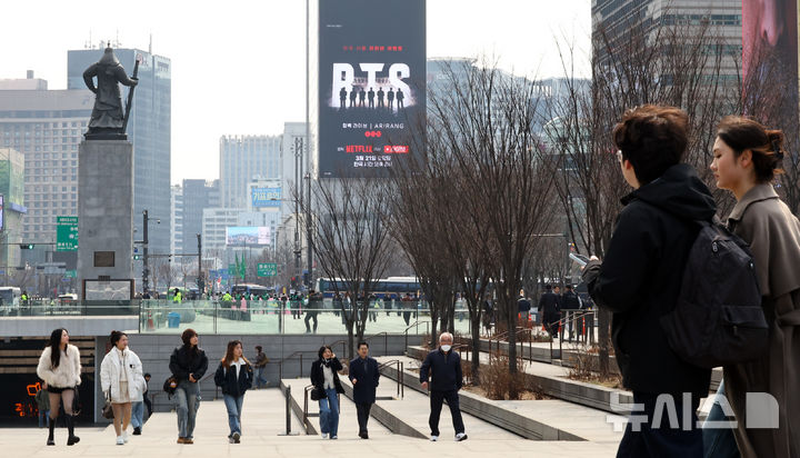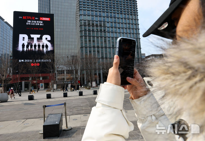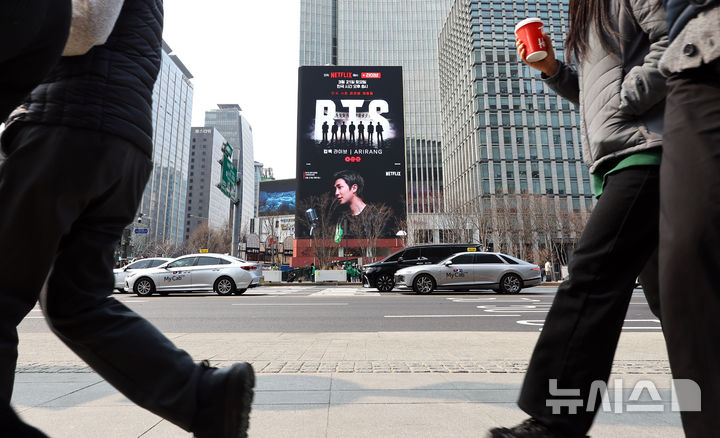 【NEWSIS】ソウル・光化門広場で開かれる防弾少年団のカムバック公演まであと十日と迫った11日、ソウル市鍾路区の光化門広場近くの電光掲示板に、BTSカムバック公演関連の広告が表示されている様子。