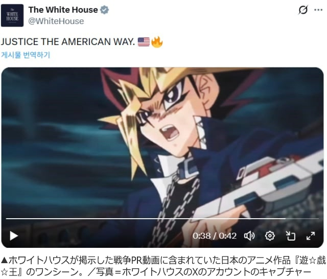 問題になった映像は、ホワイトハウスが今月6日(現地時間)に公開した戦争PR動画だ。「米国流の正義(JUSTICE THE AMERICAN WAY)」というタイトルが付けられた動画には、複数の爆撃の様子と共に、ハリウッドのヒーロー映画をつぎはぎした場面が含まれていた。『遊☆戯☆王』のほかにも映画『アイアンマン』『トップガン』などが登場する。