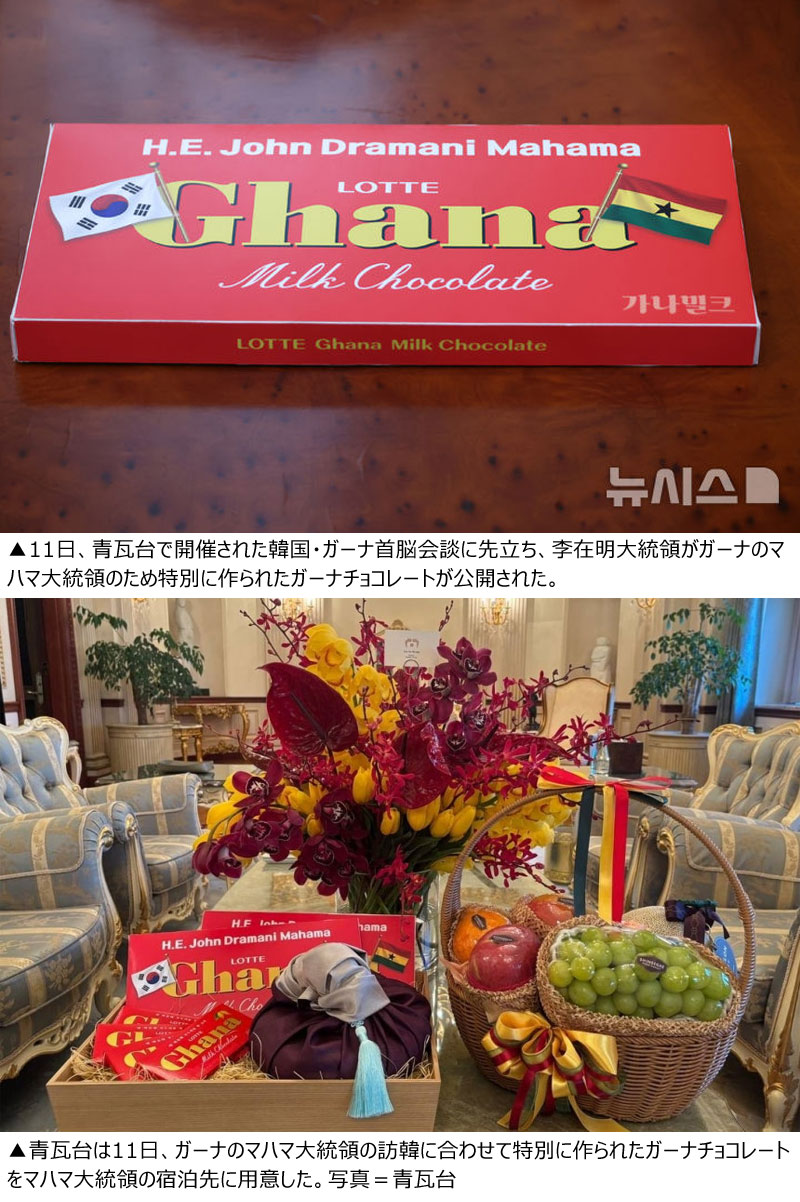青瓦台によると、李大統領は10日に来韓したマハマ大統領の宿泊先にガーナ産チョコレートを「ウェルカムギフト」として用意したとのことだ。赤いガーナミルクチョコレートの包装紙にマハマ大統領の名前と両国の国旗の写真を入れる形で特別に作られたものだ。