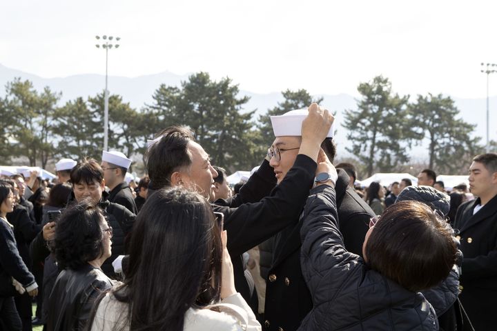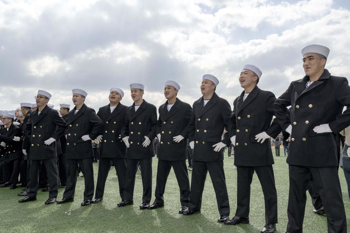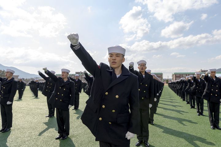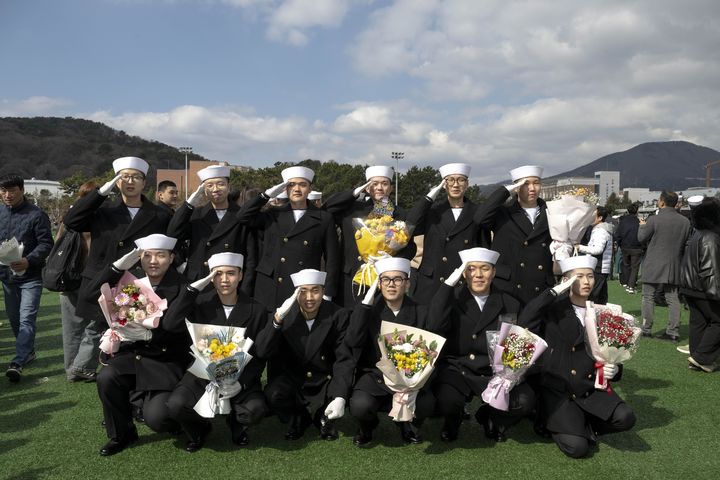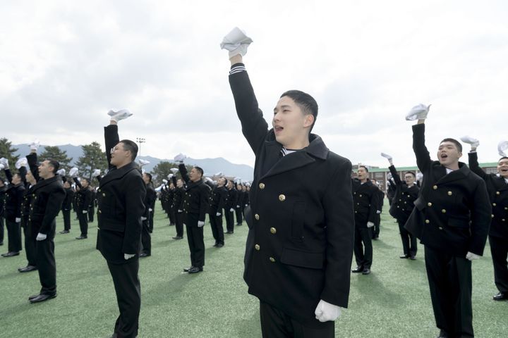 【NEWSIS】慶尚南道昌原市鎮海区の韓国海軍教育司令部基礎軍事教育団練兵場で13日、「海軍兵722期修了式」が開かれ、修了生たちが記念撮影をしている様子。