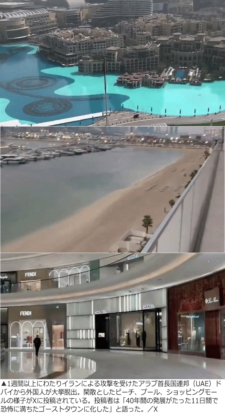 米イスラエルとイランによる戦争が長期化の兆しを見せる中、アラブ首長国連邦(UAE)ドバイから外国人住民や観光客の脱出が続いている。かつて億万長者の「黄金の遊び場」とも呼ばれた町は戦争の影響でわずか2週間でゴーストタウンと化した。