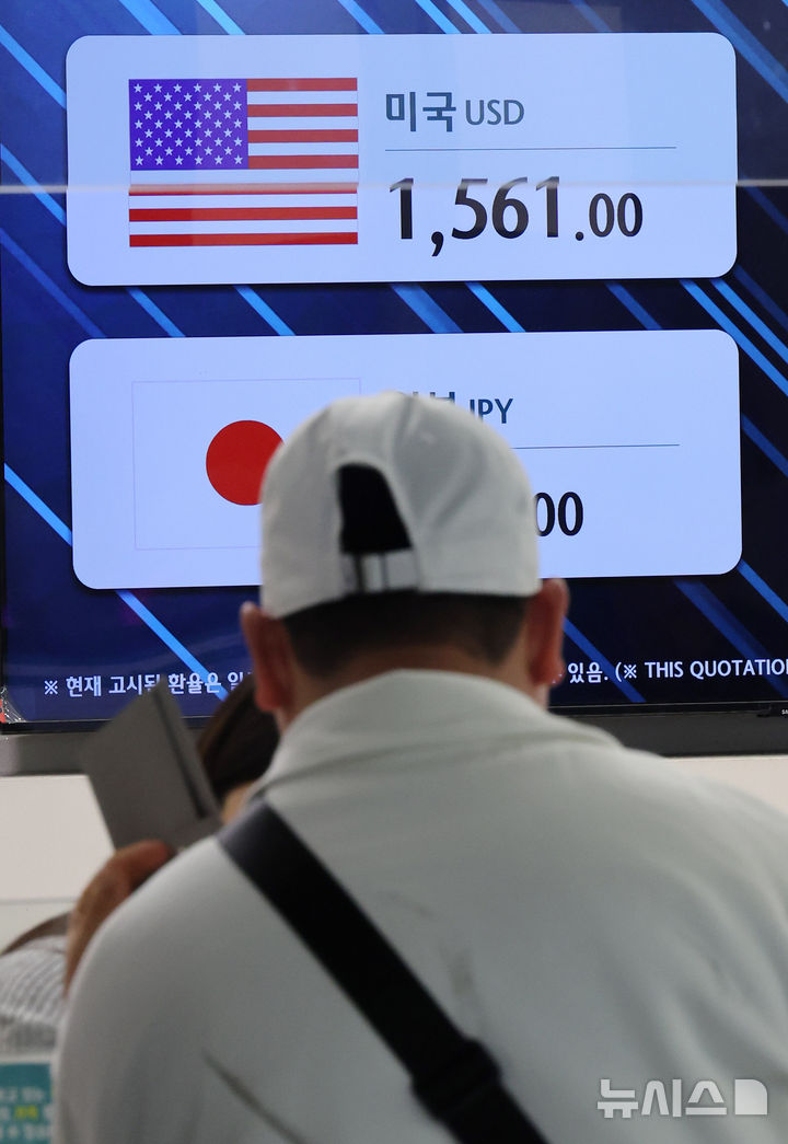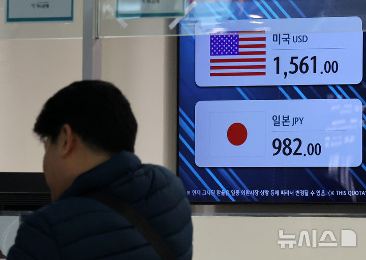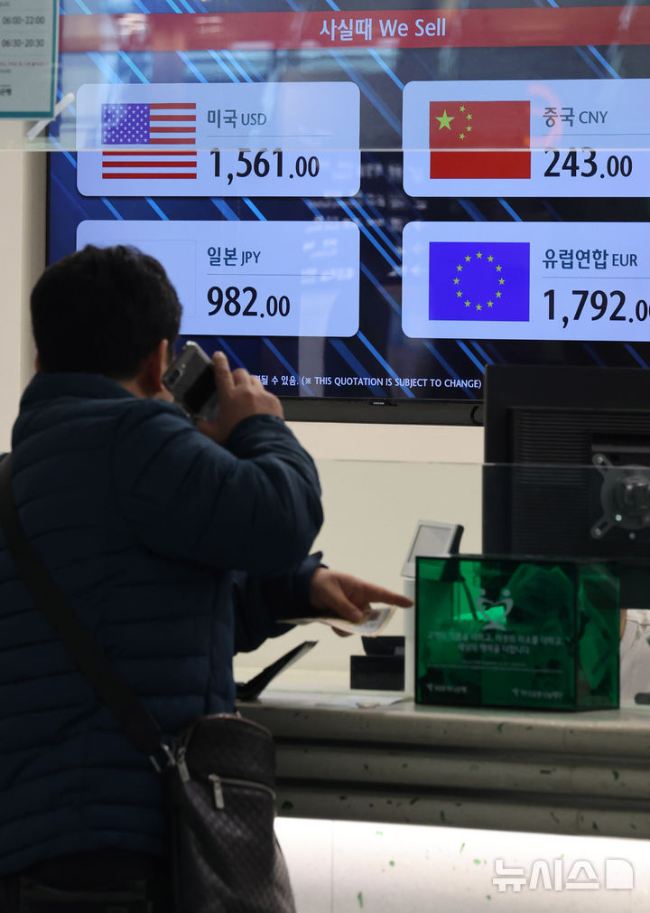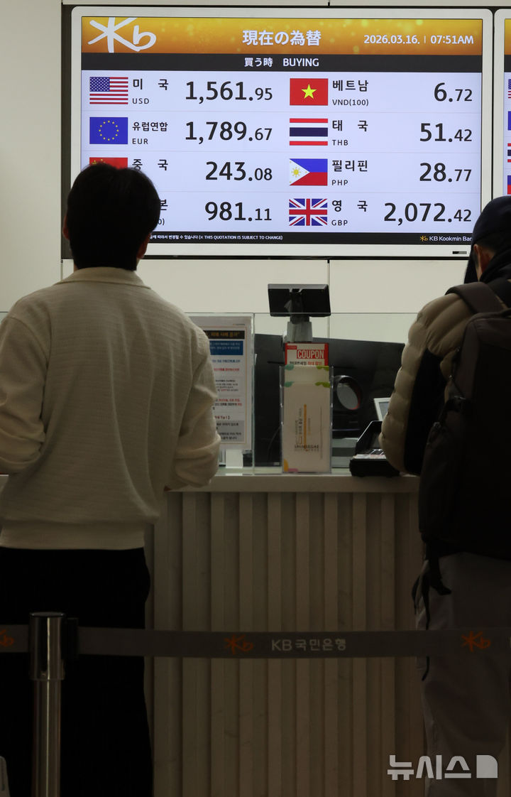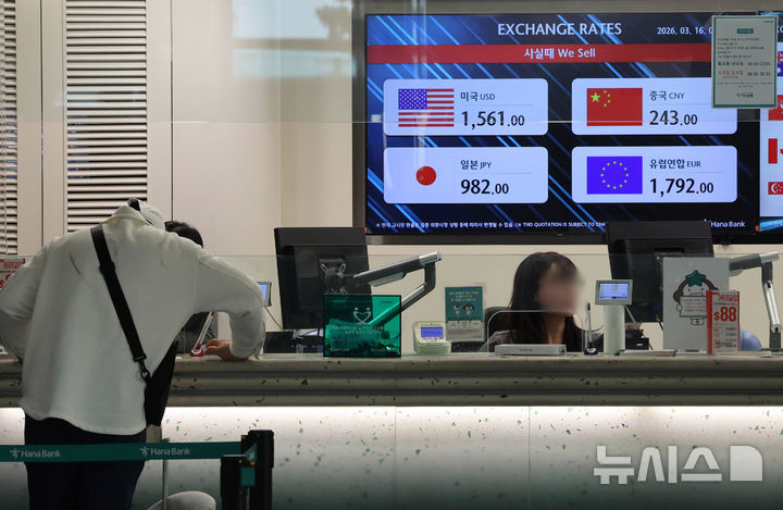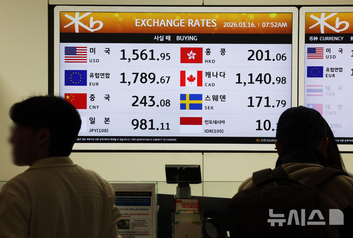 【NEWSIS】イラン攻撃の余波で、為替レートが1ドル=1500ウォン台を超えた16日午前、仁川国際空港の両替所の電光掲示板。1ドル=1560ウォン台のドル高ウォン安となっていた。