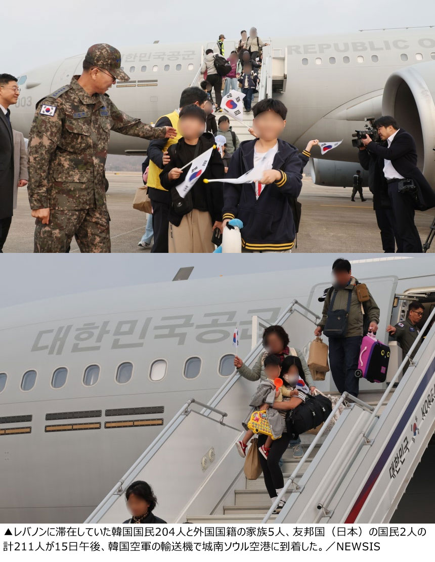 輸送機は、韓国人204人と外国国籍の家族5人、日本国民2人の計211人を乗せて離陸し、15日午後5時59分に城南ソウル空港(軍用空港)に着陸した。