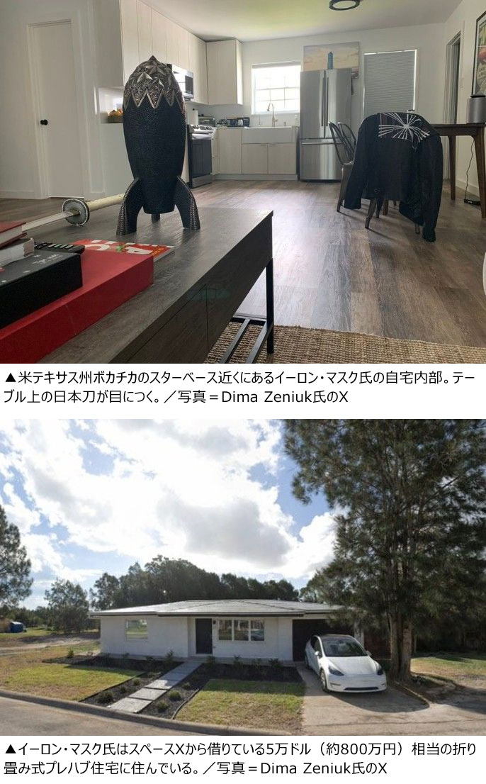 テスラやスペースXなどに関するニュースや画像を投稿するDima Zeniuk氏が自らのSNSにテキサス州ボカチカのスペースX近くに住むマスク氏の自宅内部の写真を投稿した。Zeniuk氏はこの写真と共に「華々しいものは何もない、ただ生活に必要なものだけがある家」とのコメントをつけた。