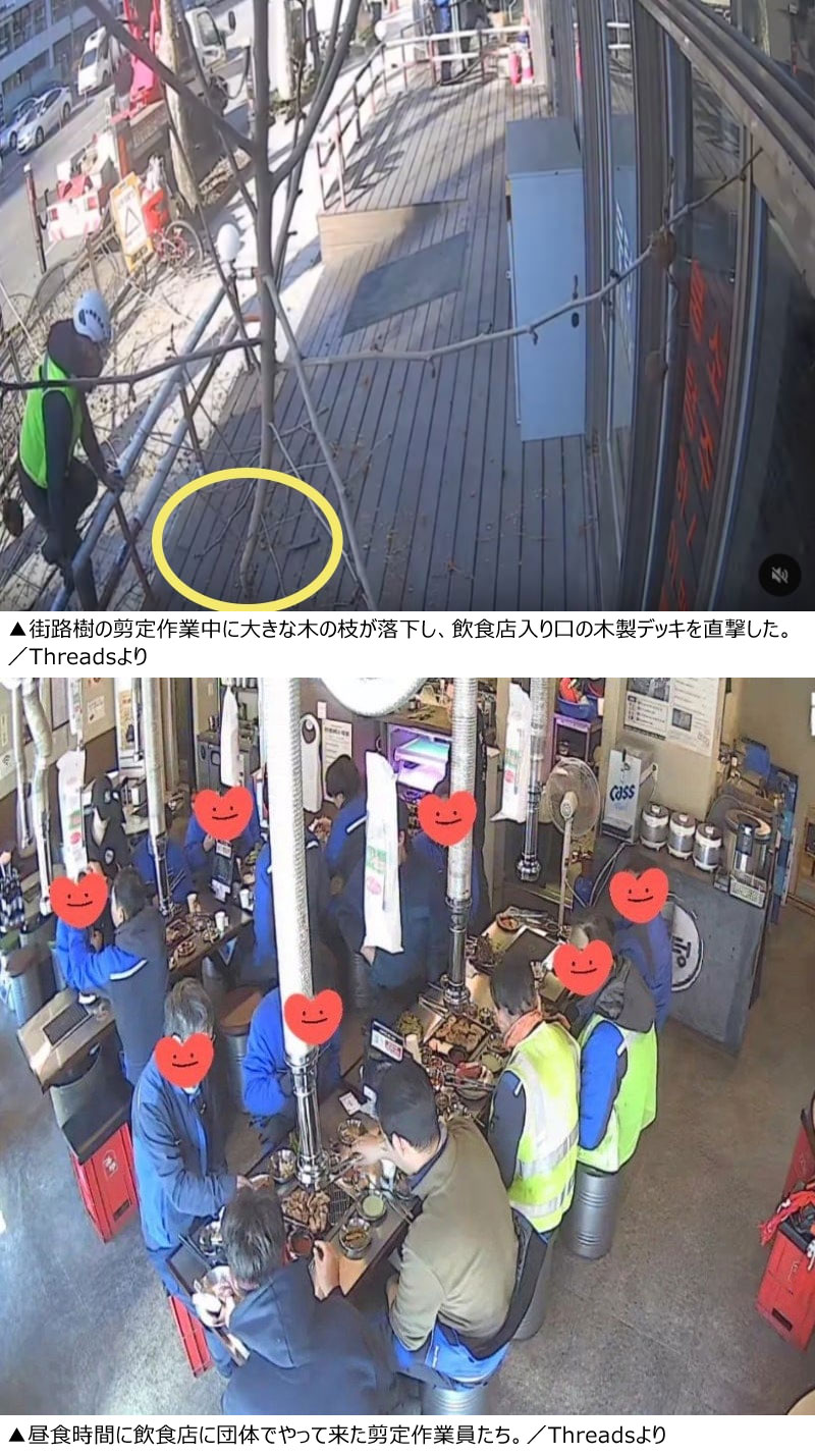 街路樹の剪定作業の影響で被害を受けた飲食店が、補償を求めず不問に付したところ、作業員18人がその店で食事会を開いて店側の好意に応えていたというエピソードが伝えられ、話題になっている。