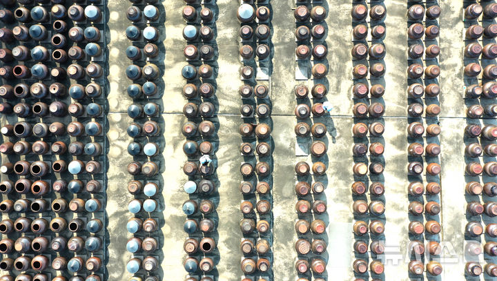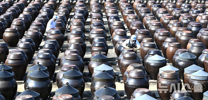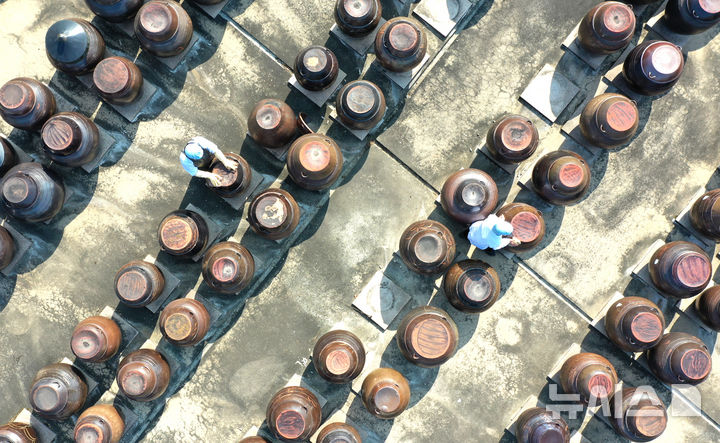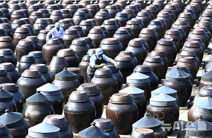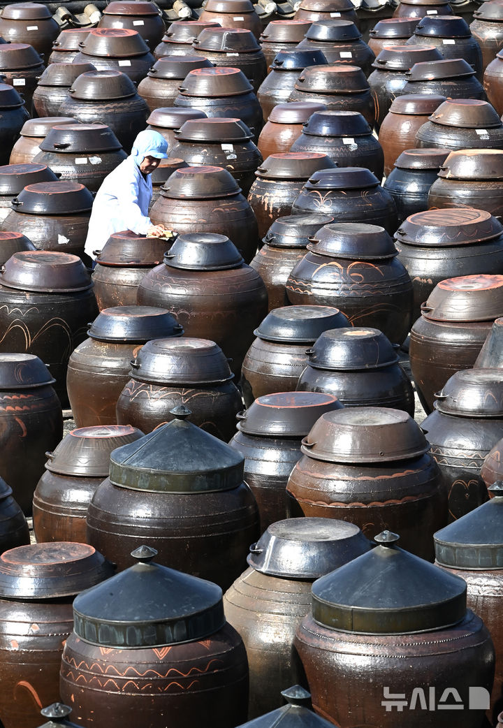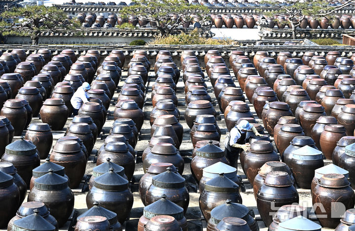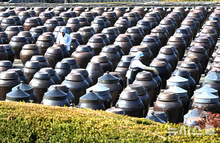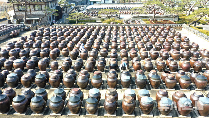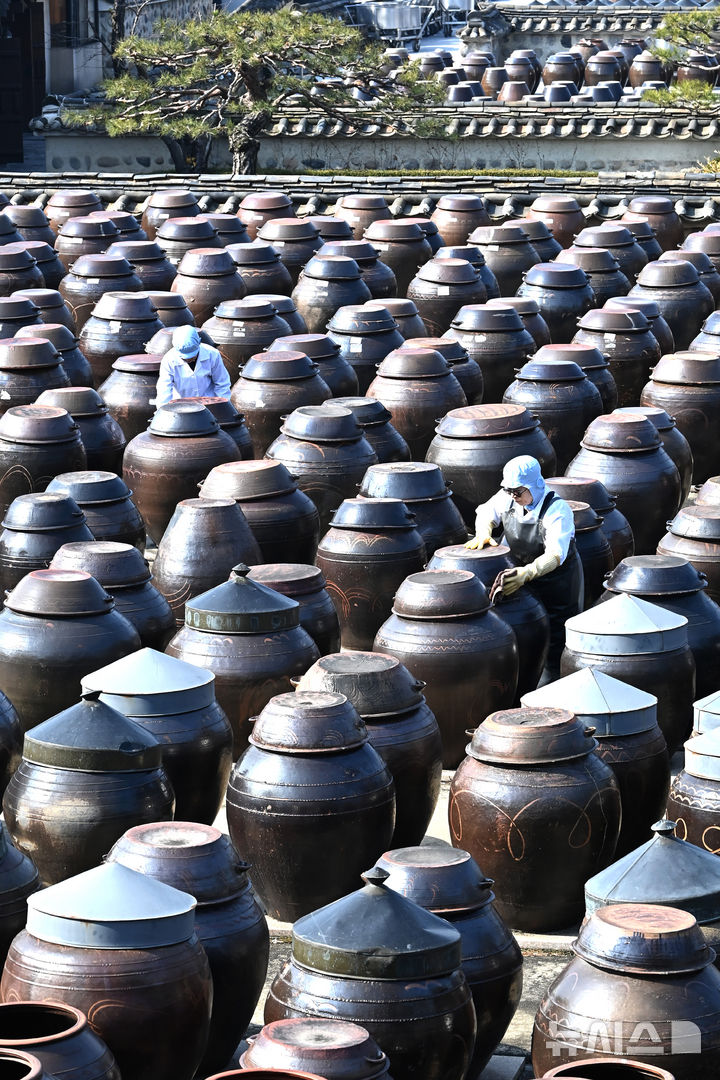 【NEWSIS】二十四節季の一つ「春分」まであと三日と迫った17日、京畿道安城市一竹面の「ソイル農園」のジャンドク台(甕置き台)では、従業員が壺に積もった埃を払っていた。