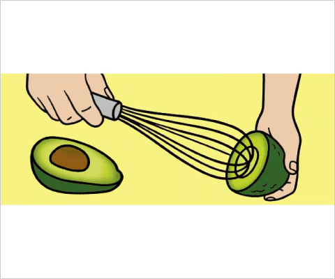 アボカドは半分に切って種を取り除き、泡立て器で切ってみよう。泡立て器を当ててしっかりと押し込み、1回転させると食べやすい大きさに切れる。