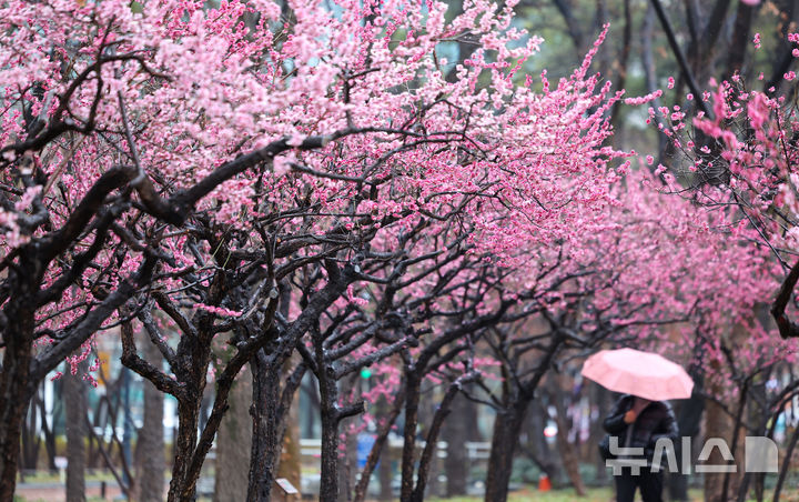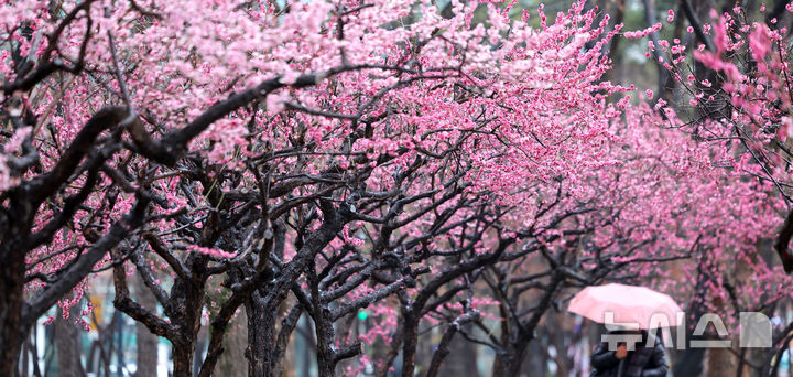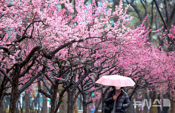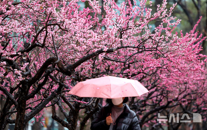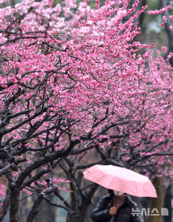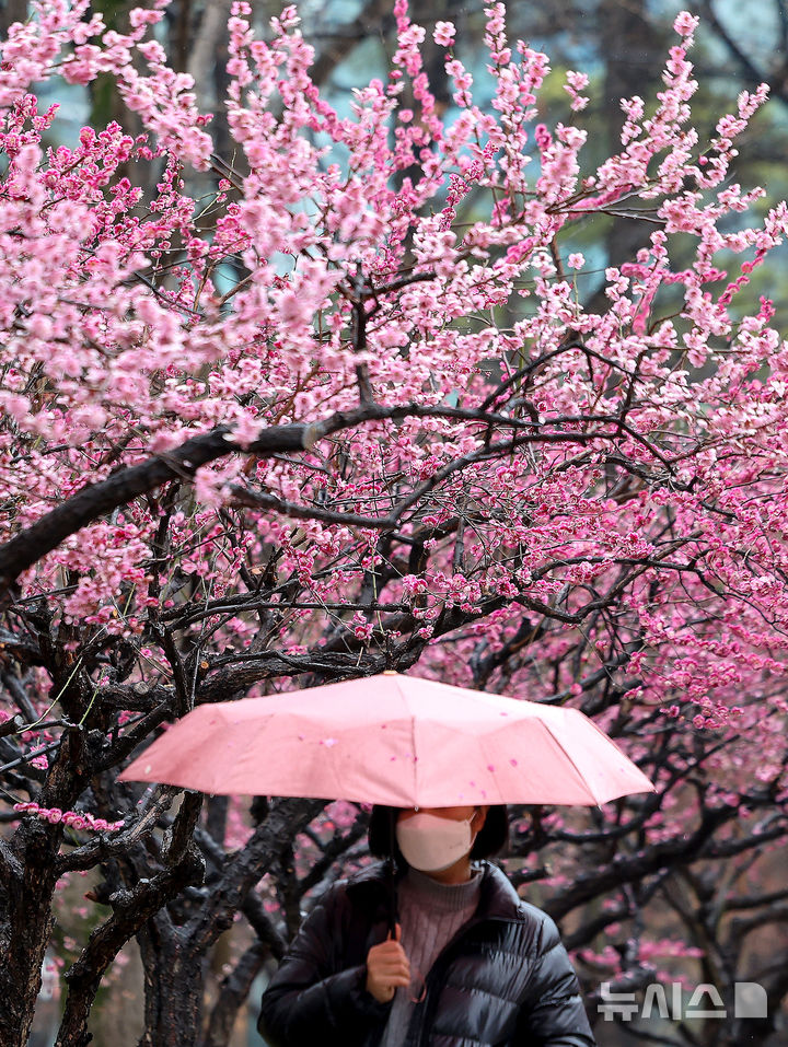 【NEWSIS】春の雨が降った18日、大邱市中区の国債報償運動記念公園で満開になった紅梅と、その下で雨傘を差して散策している市民の様子。