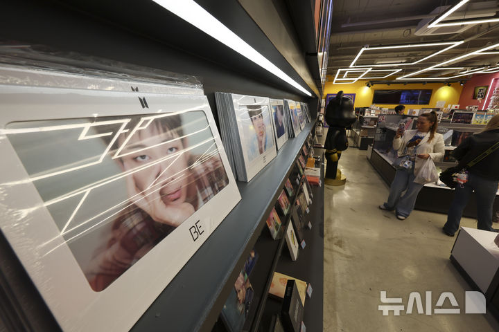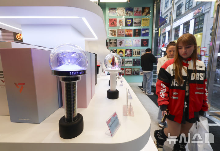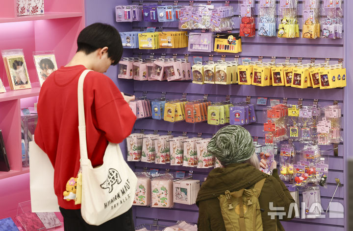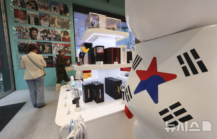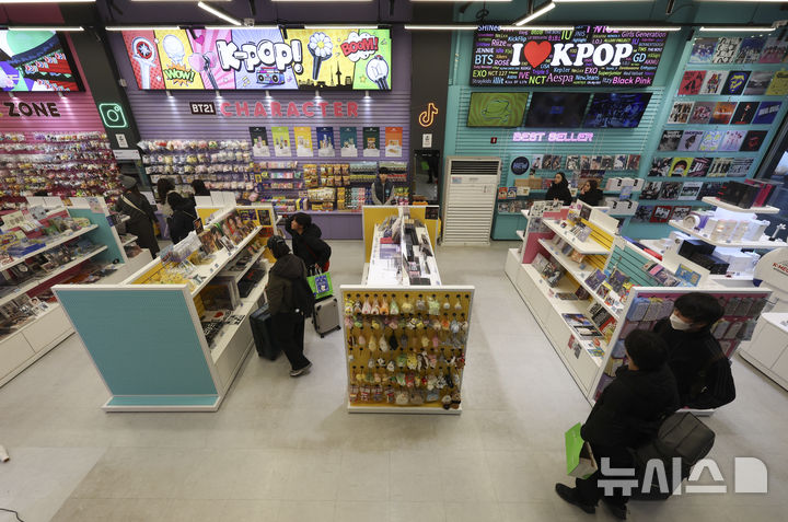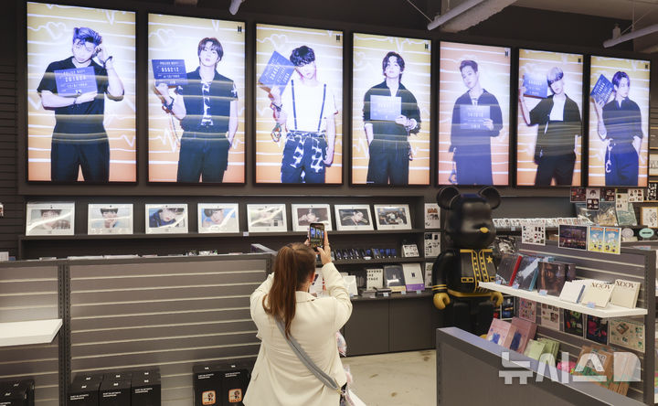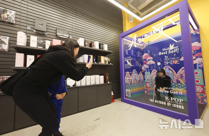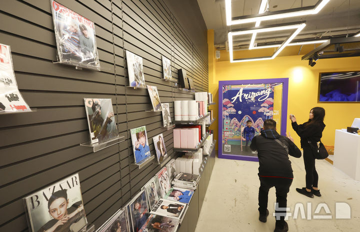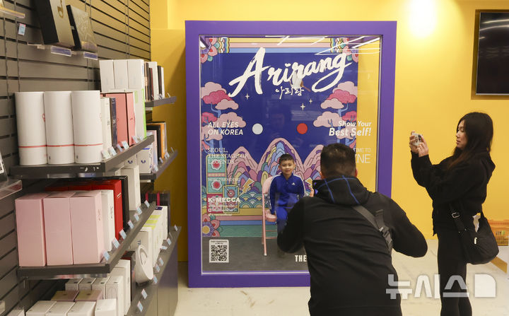 【NEWSIS】防弾少年団のカムバックライブ「ARIRANG」の光化門公演まであと三日に迫った18日午後、ソウル市中区の明洞通りに位置するK-MECCA明洞本店で写真を撮っている外国人観光客の様子。