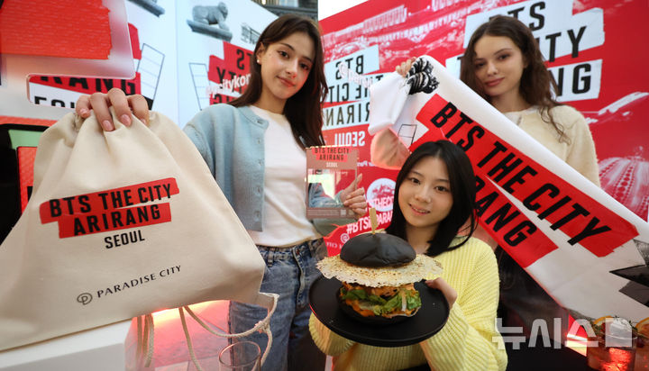 【NEWSIS】20日午前、仁川市中区のパラダイスシティで、防弾少年団のカムバックを記念する限定盤グッズ5種類と「ブラックバーガー」などの飲食物を紹介するコンパニオン。