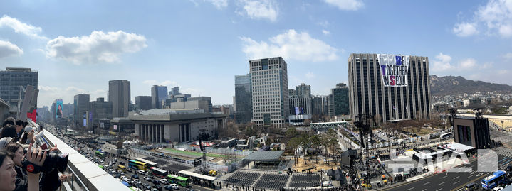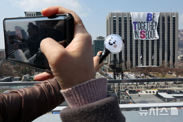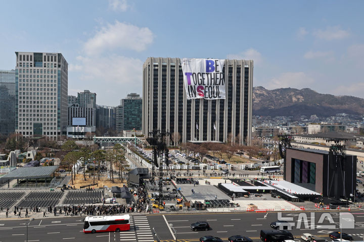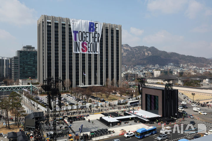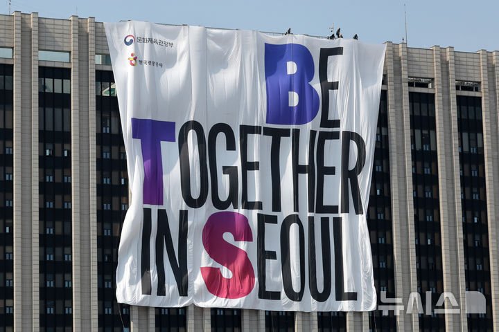 【NEWSIS】防弾少年団のカムバック光化門公演を祝う大型の垂れ幕「BE TOGETHER IN SEOUL」が20日、ソウル市鍾路区の政府総合庁舎外壁に設置された様子。