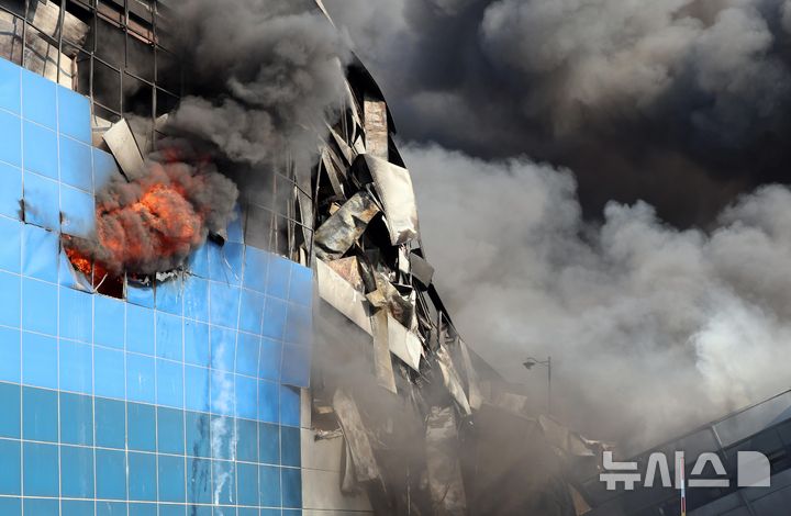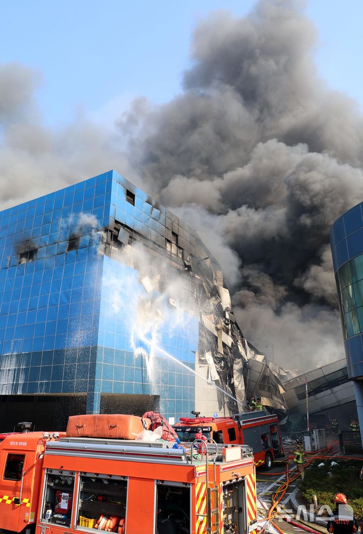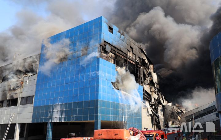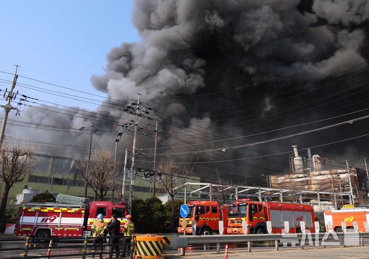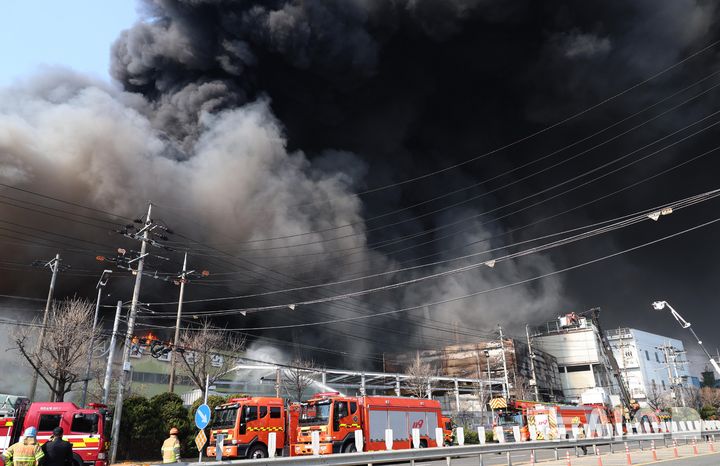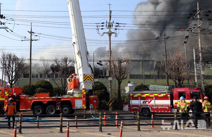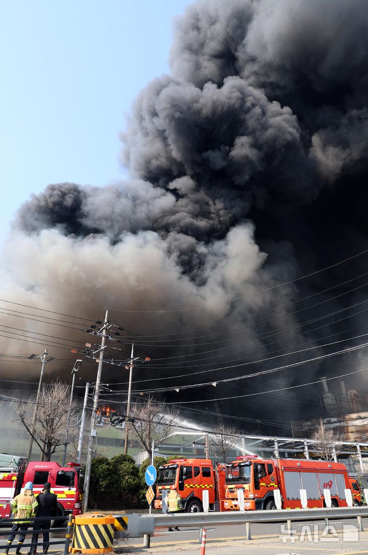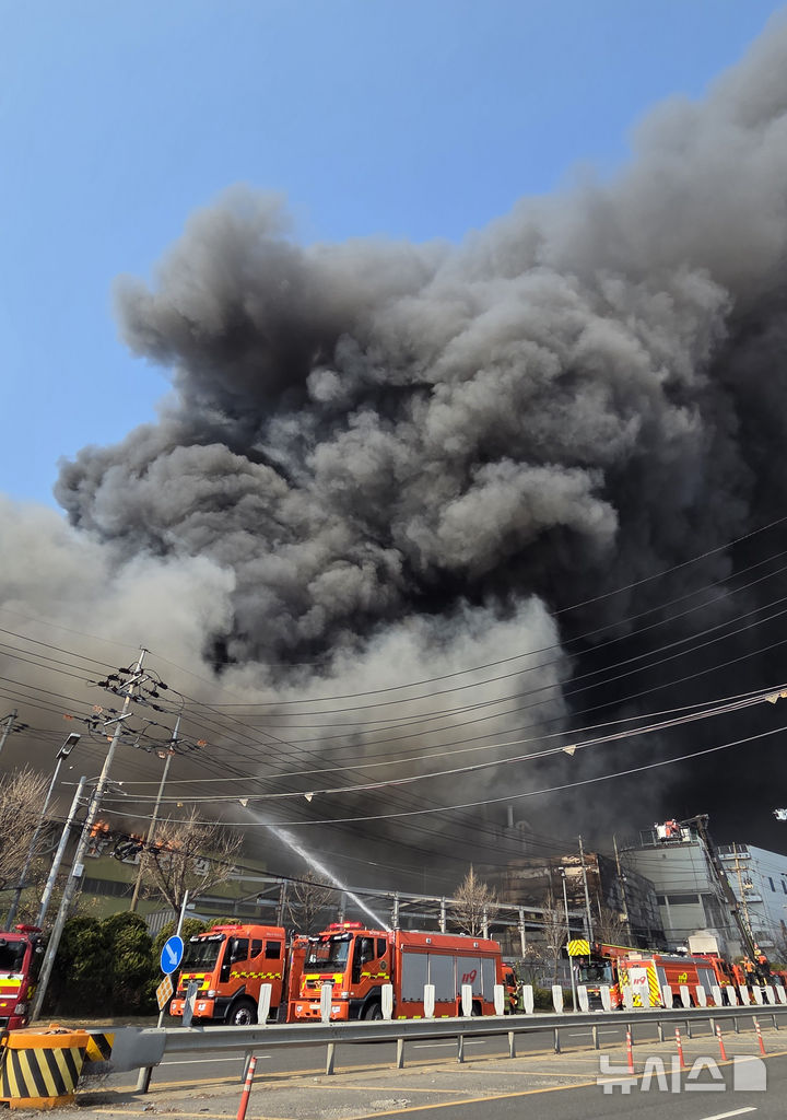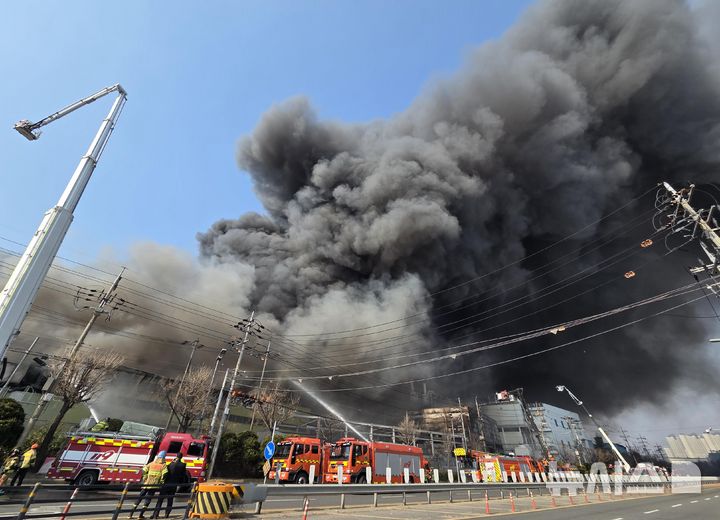 【NEWSIS】20日午後1時17分ごろ、大田広域市大徳区文坪洞の自動車部品工場で火災が発生し、消防隊員らが消火作業に当たっている様子。