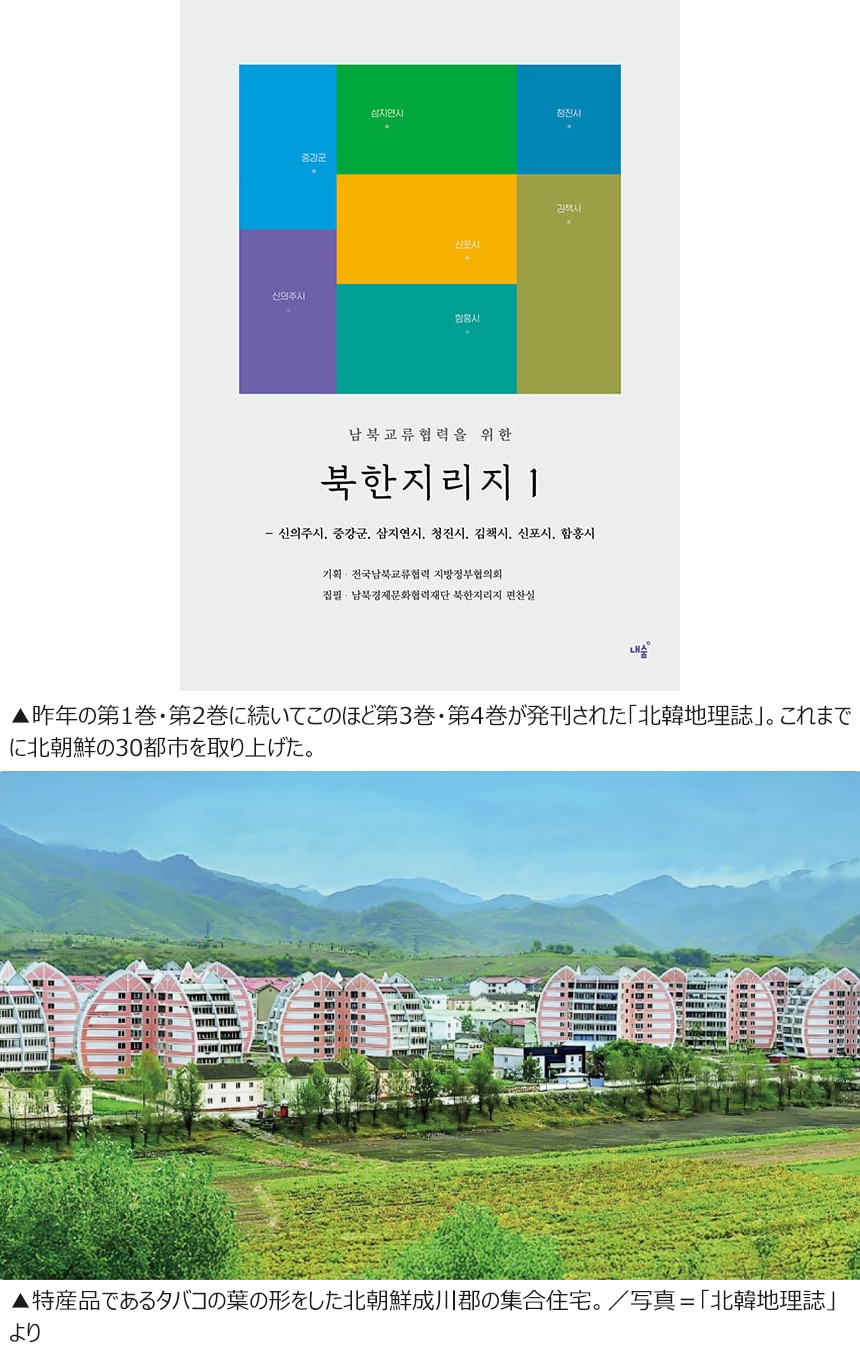 こうした中、北朝鮮の各都市の歴史と行政、産業、社会・文化、交通などを網羅する「北韓地理誌」が相次いで発刊された。昨年2月に第1巻・第2巻が出て、このほど第3巻・第4巻が発刊された。各巻で七つから八つの市・郡を取り上げ、これまでに計30の地域を解説した。金策市・三池淵市・定州市など聞いたことのある都市から、明川郡・載寧郡・香山郡などなじみのない場所も多い。北朝鮮があのように固く錠をかけてしまっている今、こうした地域を知ることにどういう効用があるのだろうか。