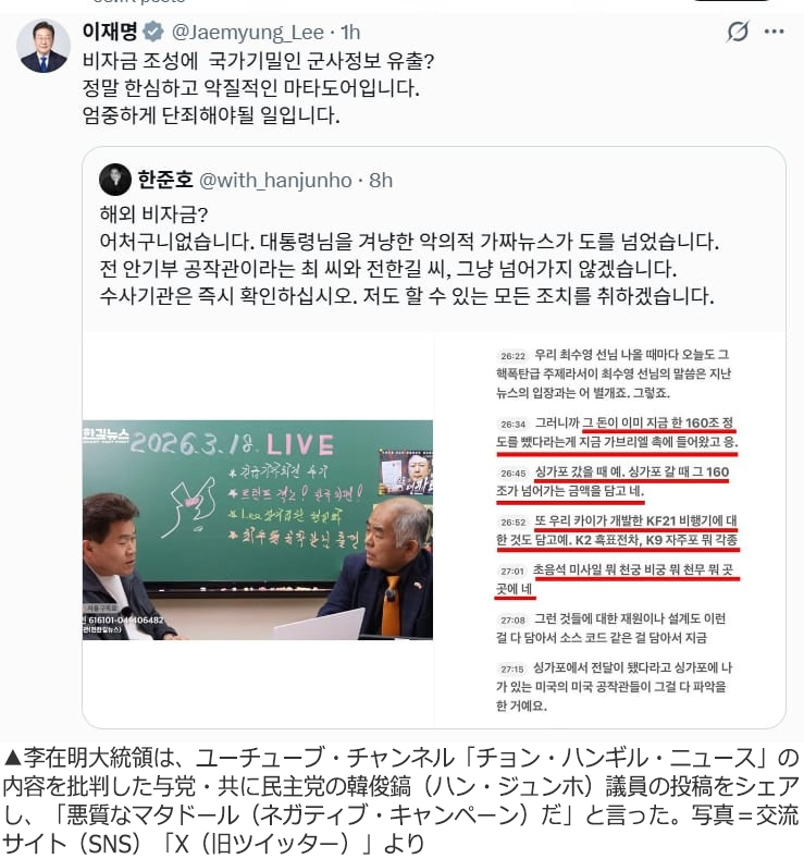 チョン・ハンギル氏は20日、自身のユーチューブ・チャンネル「チョン・ハンギル・ニュース」の配信で、同チャンネルの「李大統領裏金疑惑」に関する報道を李大統領が「情けなく、悪質だ」と批判したことに対して反論した。チョン・ハンギル氏は「李在明大統領に逆に聞きたい。(左派系ユーチューバー)金於俊(キム・オジュン)のニュースで公訴取り消し説などのフェイクニュースを流す時はなぜ制裁しないのか」と問いかけた。