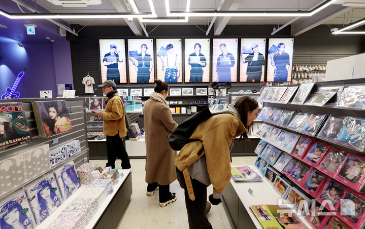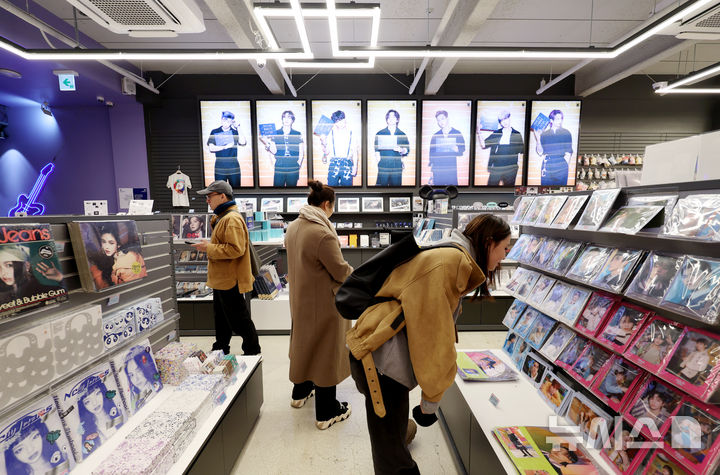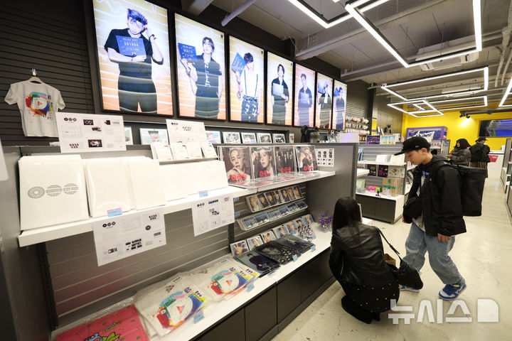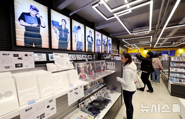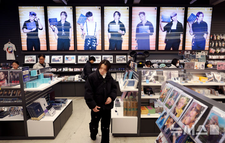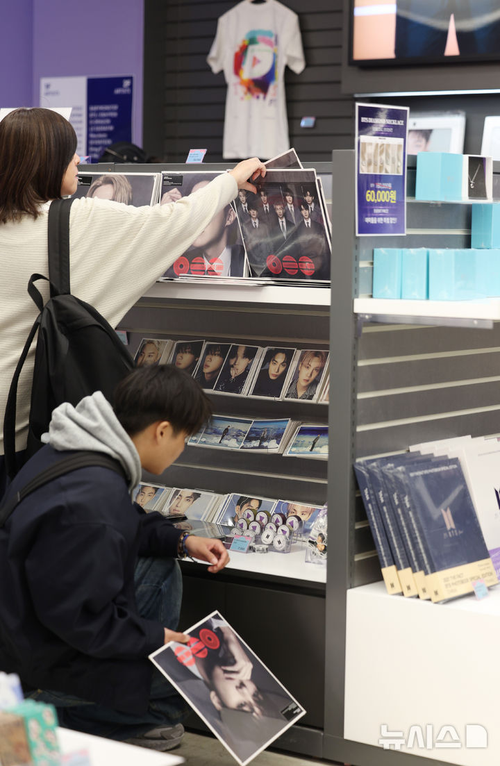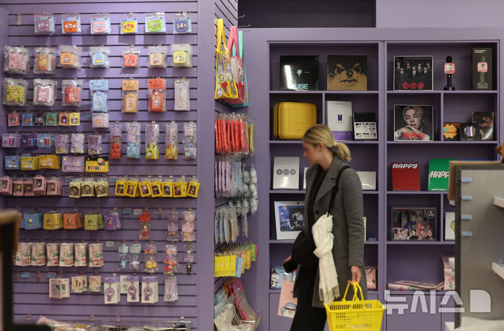 【NEWSIS】男性アイドルグループBTS(防弾少年団)のカムバック公演を機に、ソウル市内の光化門や明洞一帯のショッピング街がにぎわっている。写真は22日、ソウル市中区明洞のK-POPアイドルグッズ・ショップ「K-MECCA(ケーメッカ)」明洞本店で、グッズを見る外国人客たち。