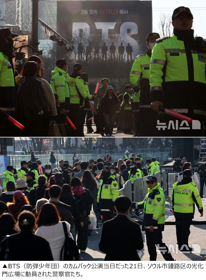 行事などの安全総括対応部処(省庁)である行政安全部はこうした予測を基に、BTSカムバック公演の安全対策を立て、同日の現場には合計1万5500人の安全対策要員が投入された。警察6700人、ソウル市2600人、消防800人、ソウル交通公社400人、行政安全部70人など、公務員・公共機関の職員だけで1万人を上回る。あとの約4800人はHYBEが動員した民間人員だ。このため、「不正確な人数予測に基づいて公務員を過度に動員したのではないか」と指摘されている。