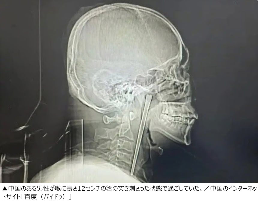香港サウスチャイナ・モーニングポスト(SCMP)が19日に報じた。それによると男性は今月初め、中国遼寧省大連市の中央病院で喉に突き刺さっていた長さ約12センチの金属製の箸を取り除く手術を受けたという。