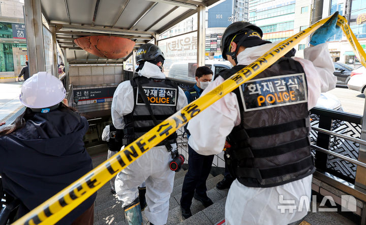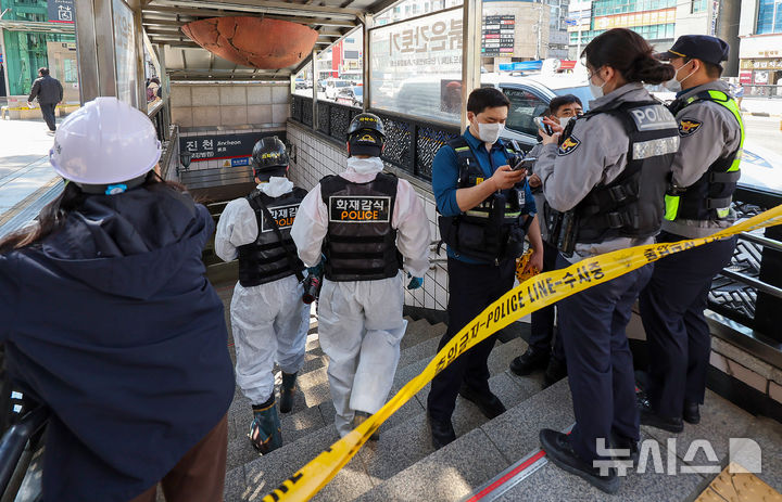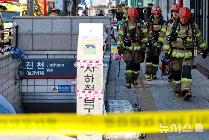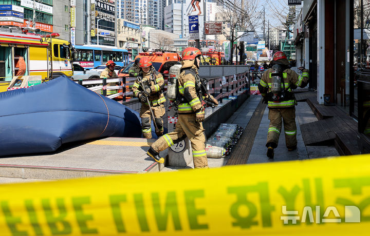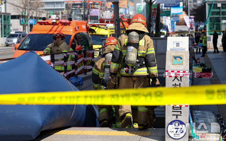 【NEWSIS】23日午後、大邱市達西区の都市鉄道1号線辰泉駅で発生した火災に対応するため出動した消防隊員の様子。