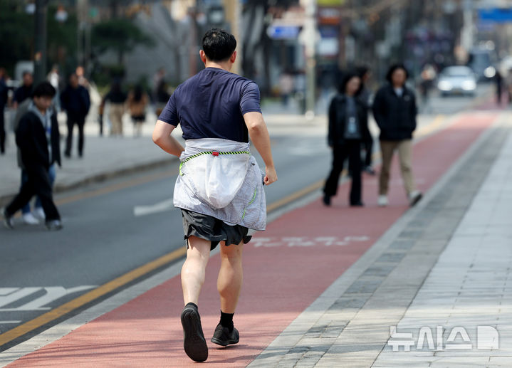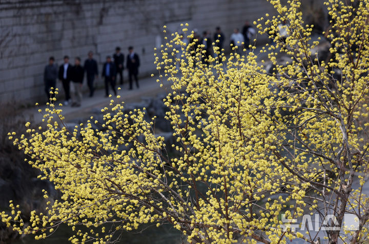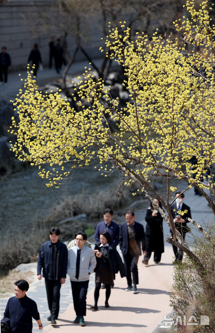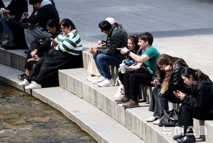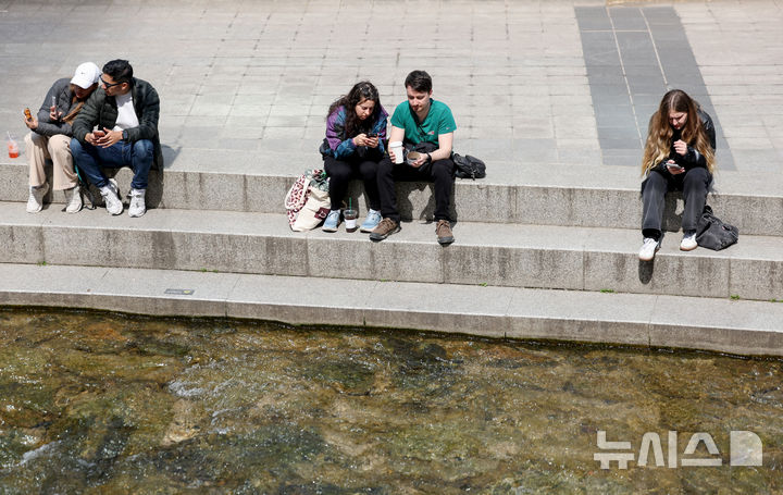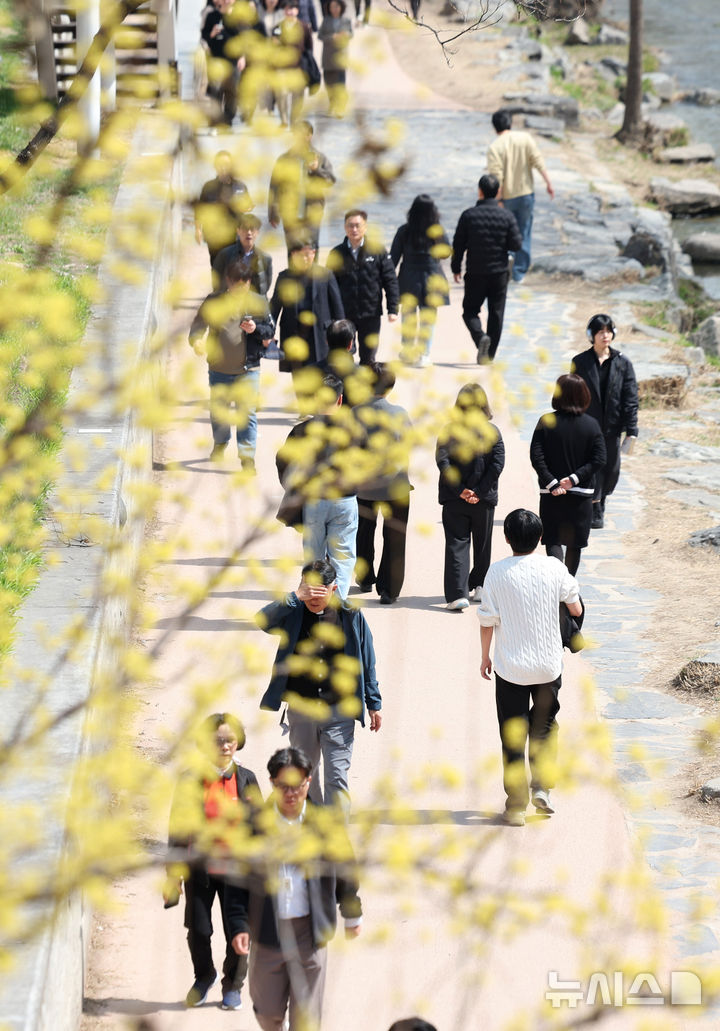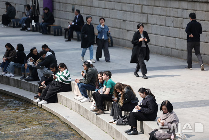 【NEWSIS】はっきりと春らしい天気になった23日、ソウルの清渓川を訪れて散策している市民の様子。
