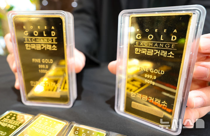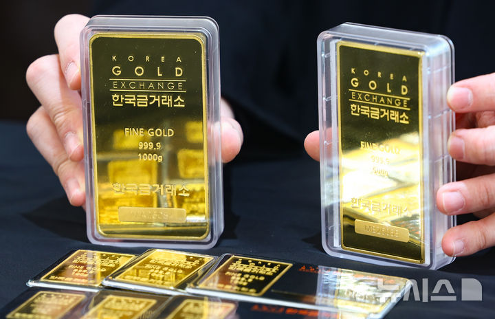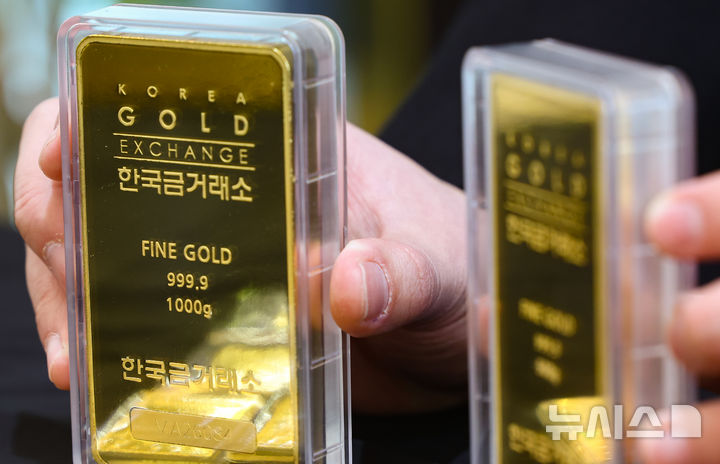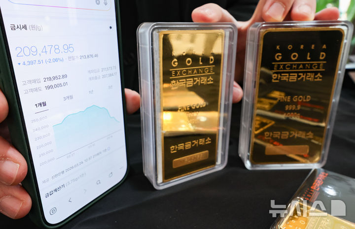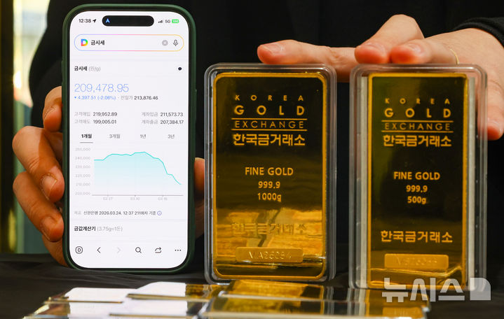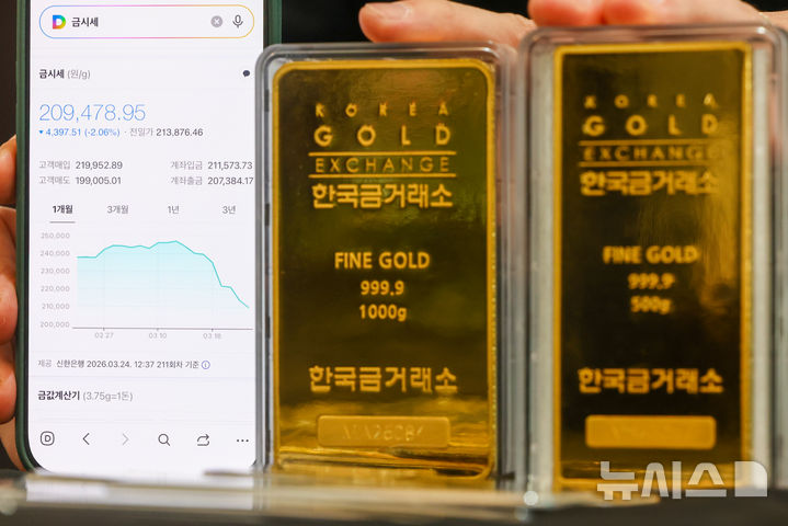 【NEWSIS】中東の戦争の余波で金価格が急落した24日、ソウル市鍾路区の韓国金取引所で、職員がゴールドバーなど金製品を整理しているところ。中東の戦争で急騰した原油価格によりインフレの懸念が強まり、金利引き下げの期待感が後退したことで、安全資産に挙げられる金の価格は下落傾向を示している。