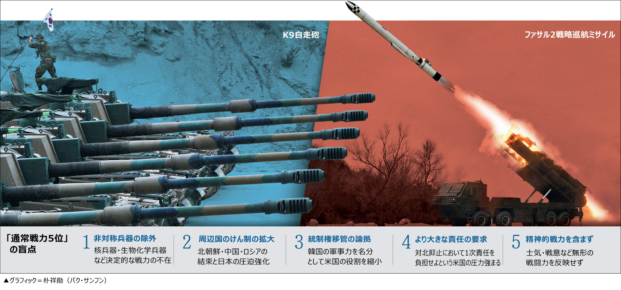 機械的な指標を基にした通常戦力の順位は、参考資料に過ぎない。過度の引用や政策根拠としての活用は禁物だ。特に、政治的活用は慎重でなければならない。韓国の軍事力5位は意味ある成果だが、戦争の勝敗を決するのは順位表ではない。核戦力・通常戦力を統合した軍事力比較モデルの開発が必要だ。核兵器を含む戦力の総体と確固たる精神的戦力に基盤を置いた、総合軍事力評価が行われなければならない。第9回党大会で金正恩(キム・ジョンウン)が自ら運転した、核弾頭の搭載も可能な600ミリ超大型放射砲(多連装ロケット砲、KN25)は、韓国全域を射程に収めている―という平壌発のニュースが、今の韓半島の現実だからだ。こんな事態にもかかわらず、米国の装備と兵力が既に到着している状況で韓米合同演習すら国防相が抗議するなど不協和音を生んでいるのは、一体誰を意識したものなのか、全く嘆かわしい。