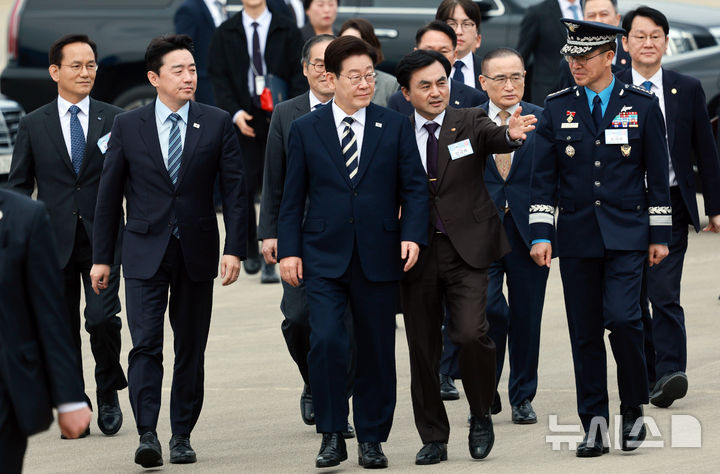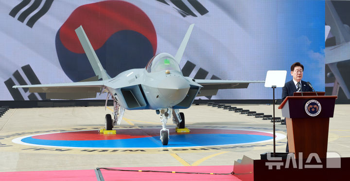 【NEWSIS】韓国の李在明(イ・ジェミョン)大統領が25日、慶尚南道泗川の韓国航空宇宙産業(KAI)で開かれたKF21量産1号機出庫式で激励の辞を述べているところ。