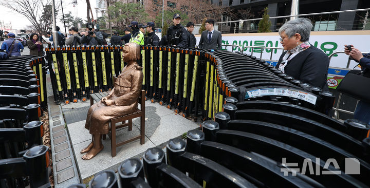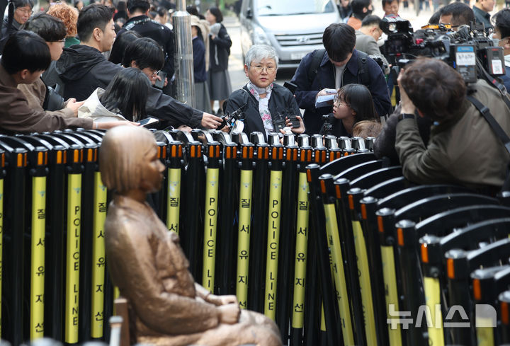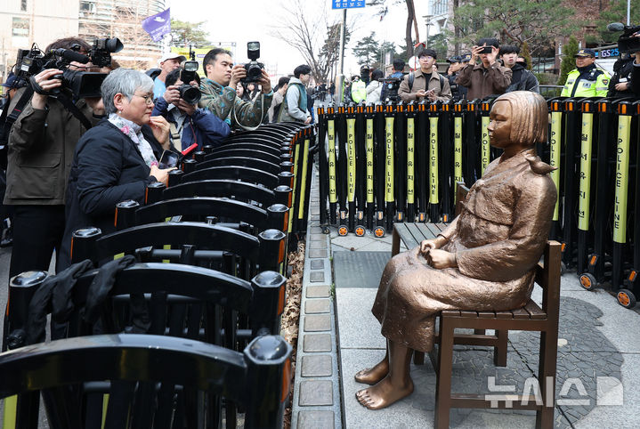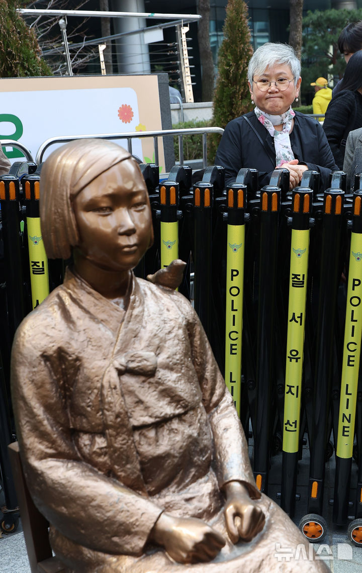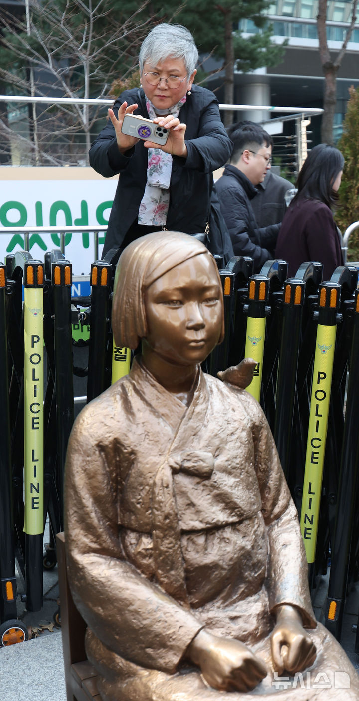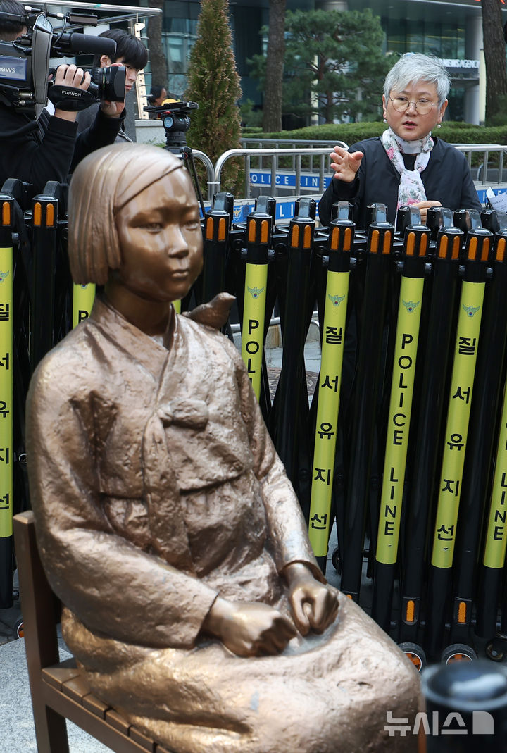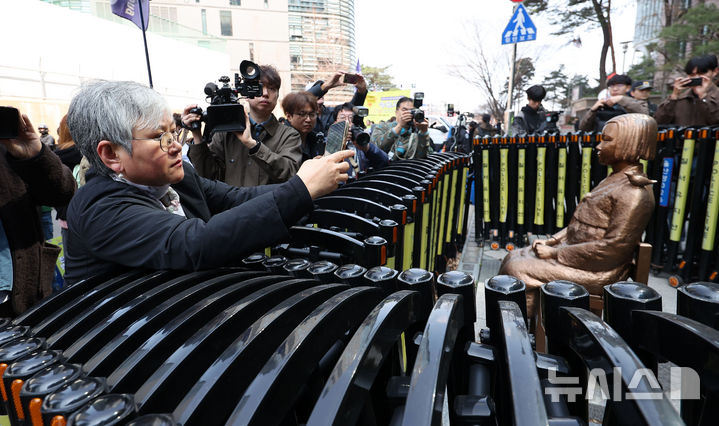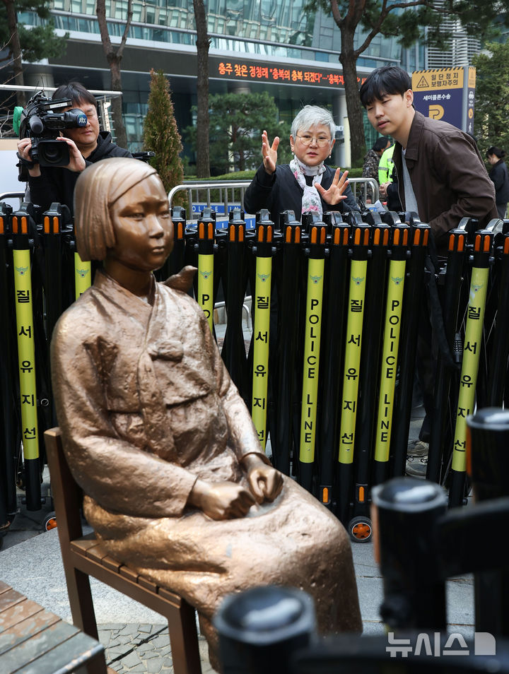 【NEWSIS】「平和の少女像」を作った作家のキム・ソギョンが25日、ソウル市鍾路区の旧駐韓日本大使館付近の像の前で開かれた第1745回日本軍性奴隷制問題解決のための水曜デモで少女像の状態を点検している。