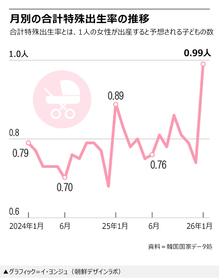 【NEWSIS】今年1月の合計特殊出生率は前年に比べ0.1増えて0.99となった。「エコブーム世代」(1991-1996年生まれ)の女性が主な出産年齢に達したことが要因と考えられる。