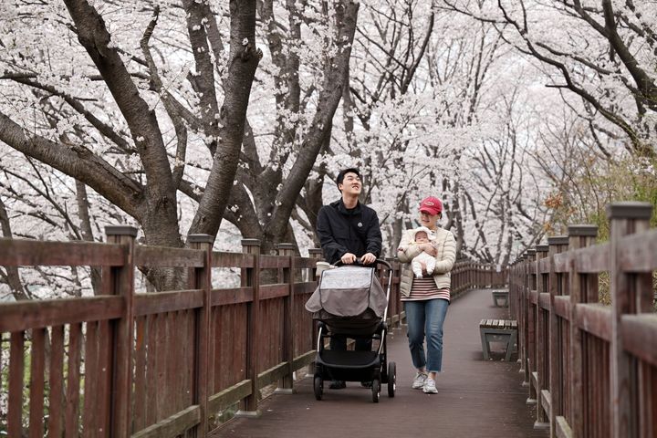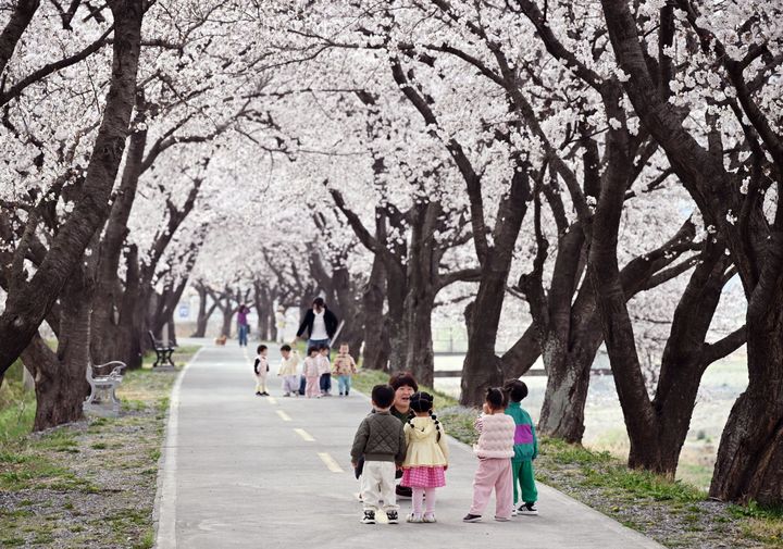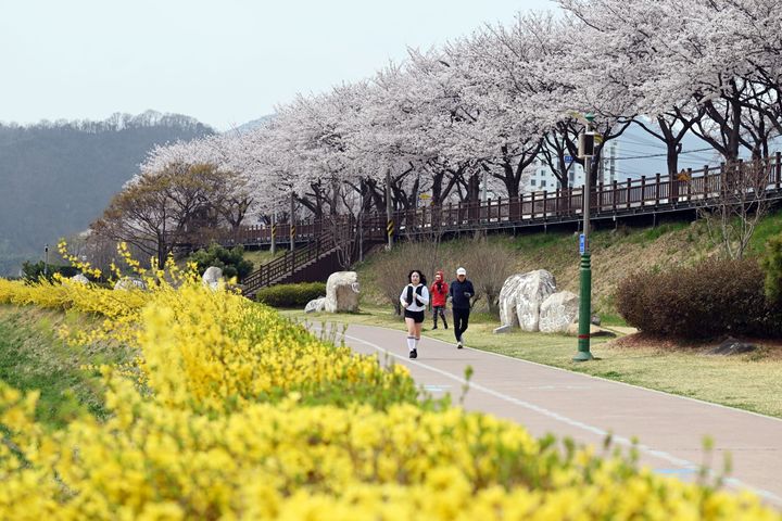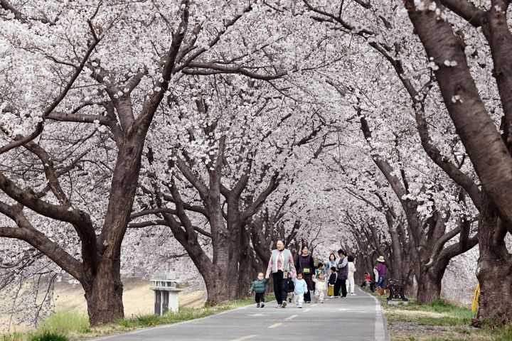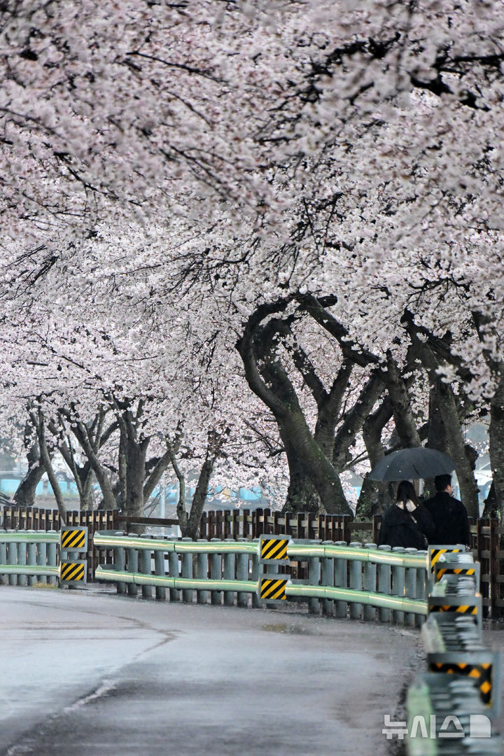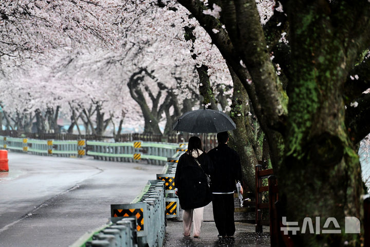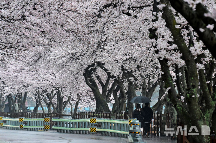 【NEWSIS】30日午後、春雨が降る慶尚南道南海郡のワンジ桜並木で、傘をさして歩く人々。