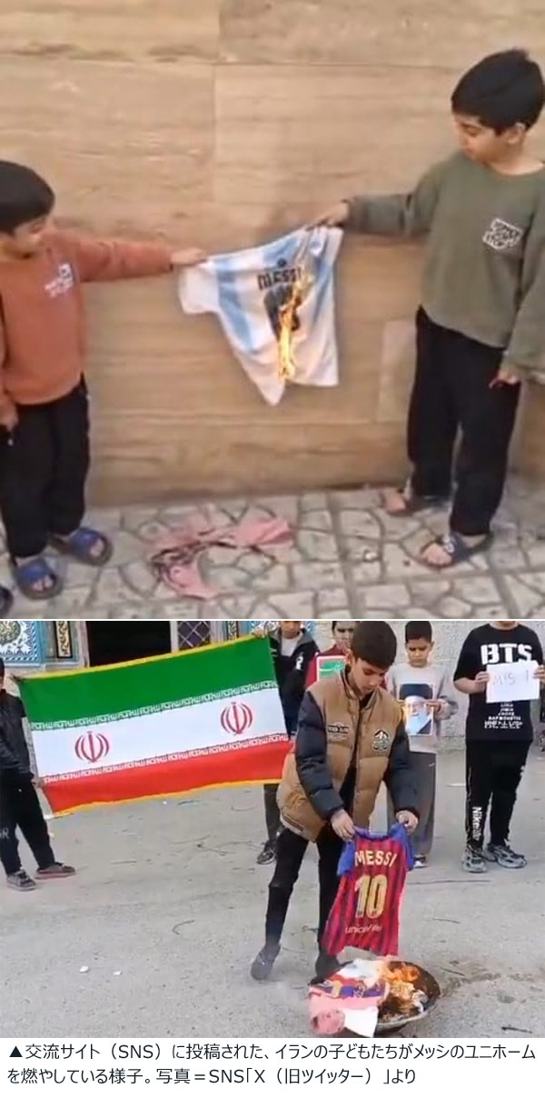 主催者側は「メッシがトランプ米大統領との会談で戦闘争を支持した行為に対し、抗議する意味でやった」と説明した。交流サイト(SNS)にはこの他にも、子どもたちがイラン国旗を掲げてメッシのユニホームを燃やす動画や写真が多数投稿されている。