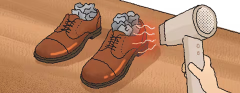 革靴が少しきつくて履きにくい時は、新聞紙を詰めてヘアドライヤーで温風を当てると、革が柔らかくなって伸び、履きやすくなる。