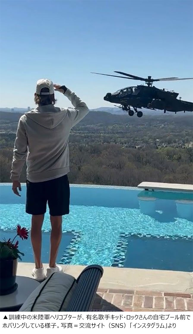 【NEWSIS】米陸軍は、訓練中のヘリコプター2機が有名歌手キッド・ロックさんの自宅プール前で不適切な飛行を行ったという疑惑に関して行政調査に着手した。AP通信が先月31日(現地時間)に報道した。