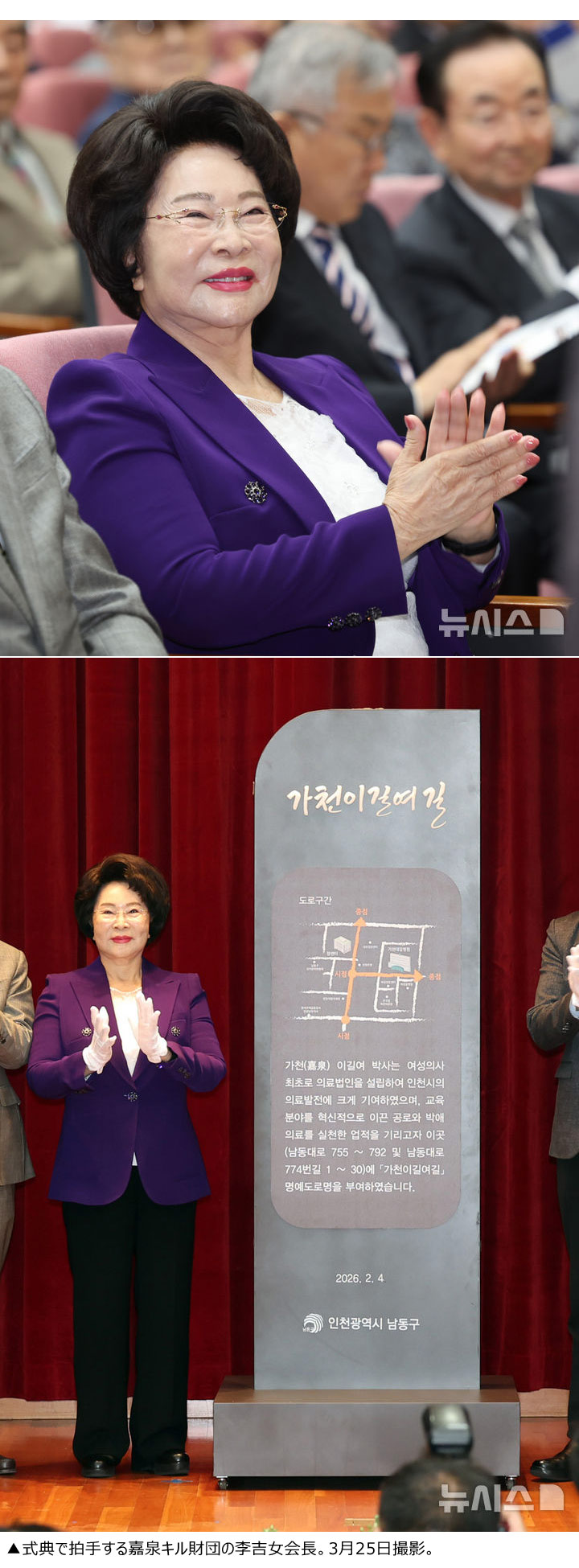開院68周年を迎えた嘉泉大キル病院は3月25日、仁川市南洞区にある病院の大講堂「嘉泉ホール」で除幕式を開催し、南洞大路一帯の530メートル区間が名誉道路「嘉泉李吉女道路」に指定されたと発表した。