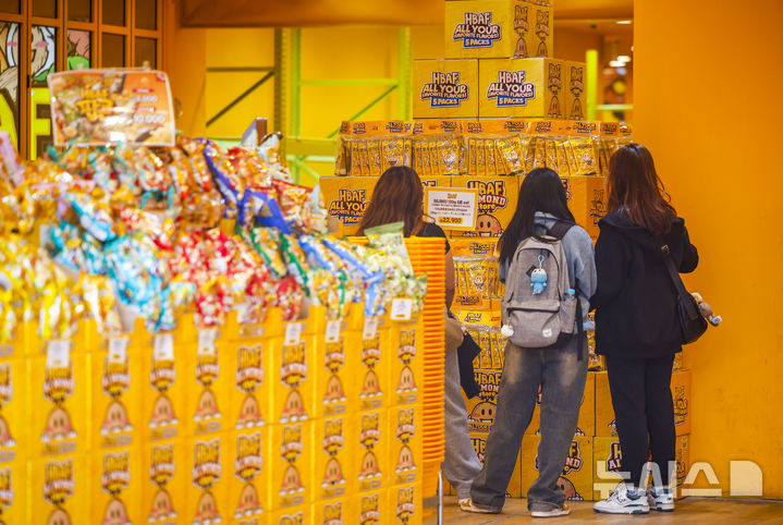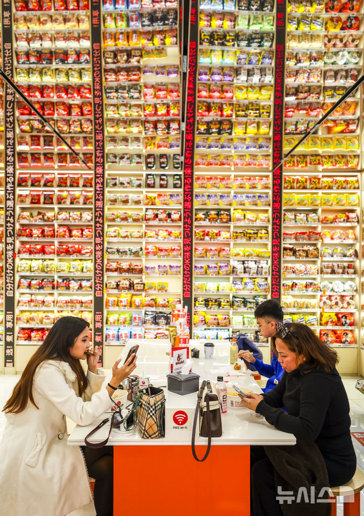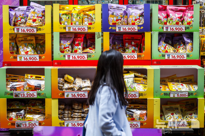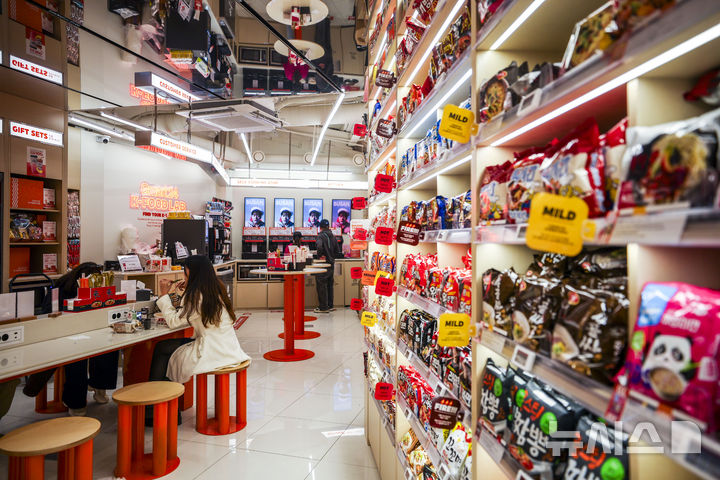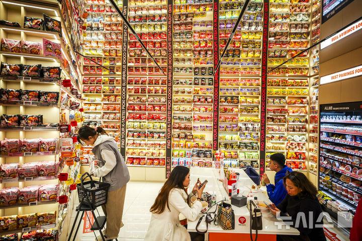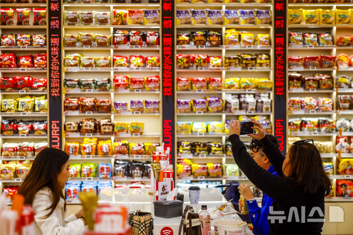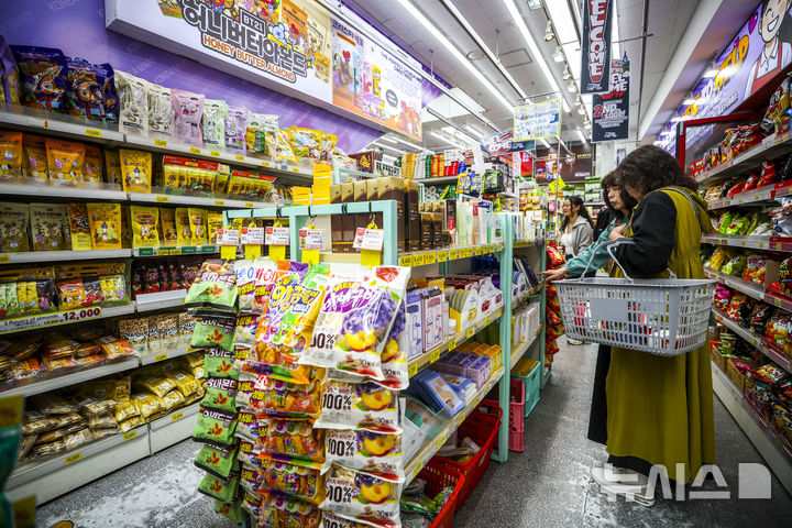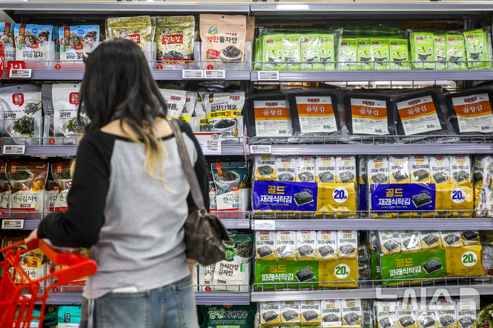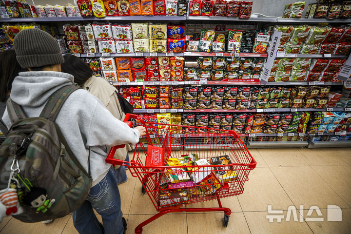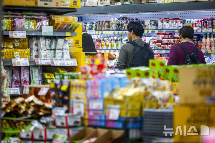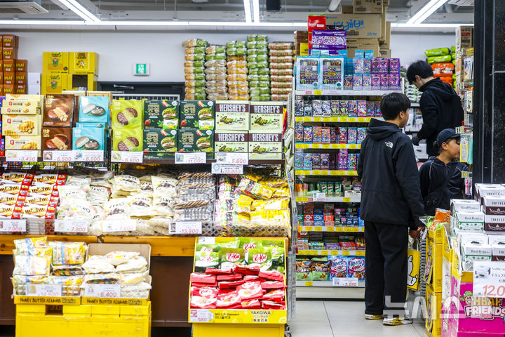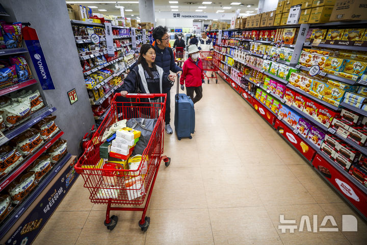 【NEWSIS】3日、ソウル市中区の大手スーパー「ロッテマート・ソウル駅店」を訪れた外国人旅行者が、菓子・ラーメン・海苔などKフードを見て回っている様子。農林畜産食品部(省に相当)は、今年第1四半期のKフード・プラスの輸出額が33億5000万ドル(現在のレートで約5346億円)で、前年同期比3.5%増となったことを明らかにした。Kフード・プラスとは、生鮮・加工農食品および動物用医薬品・農業機械・農薬・肥料など農業とその関連産業を包括する概念だ。
