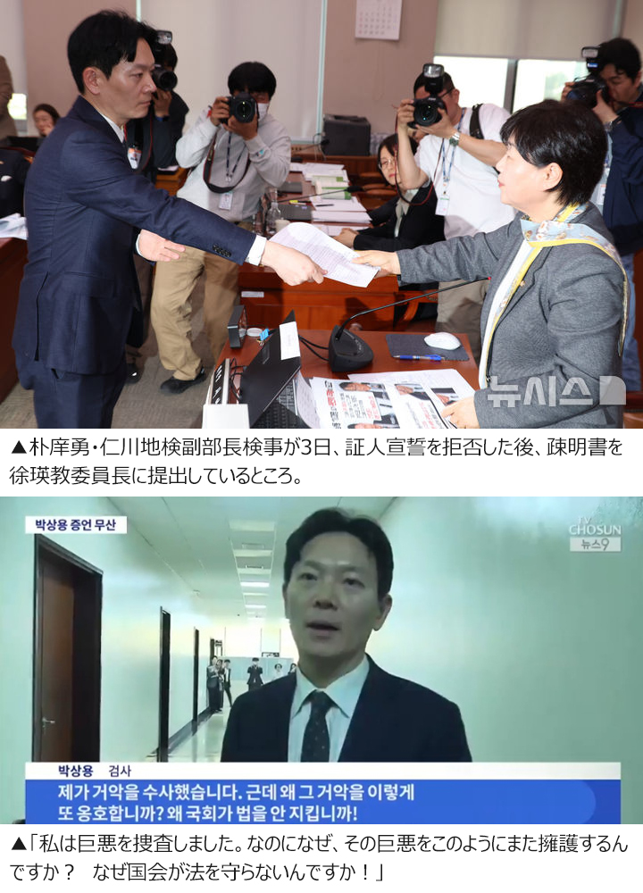 下着大手サンバンウルによる北朝鮮への送金事件を捜査した朴庠勇検事が、「公訴取り消しの足掛かりになる国政調査は違憲・違法」などの理由で宣誓を拒否したのです。