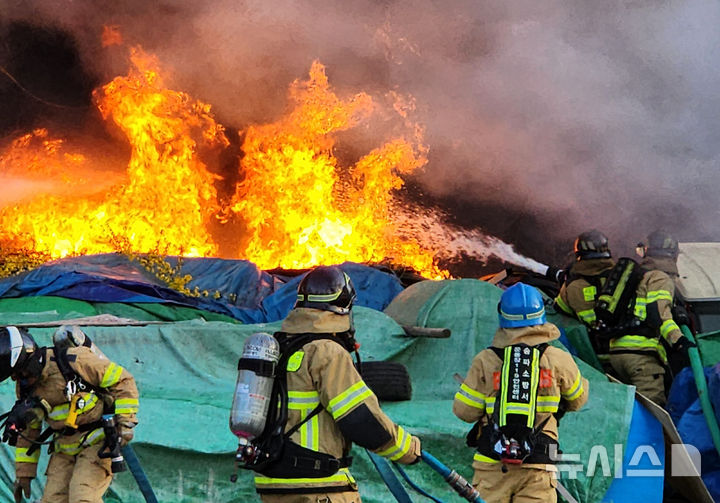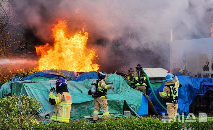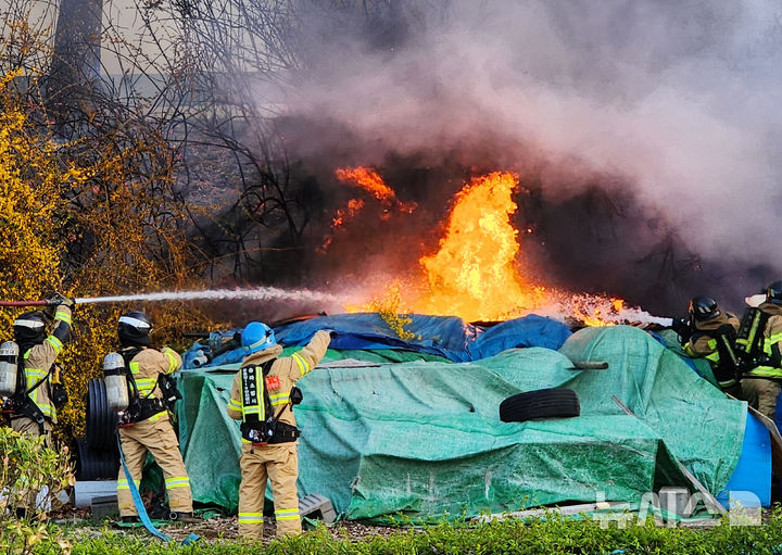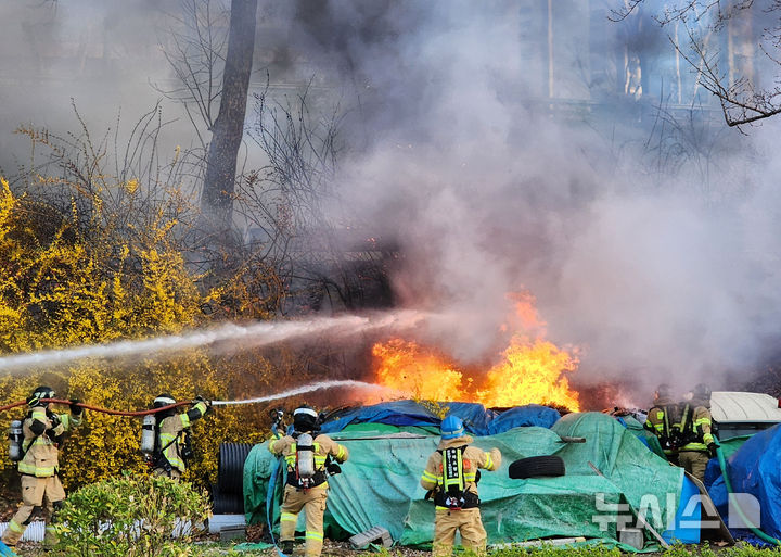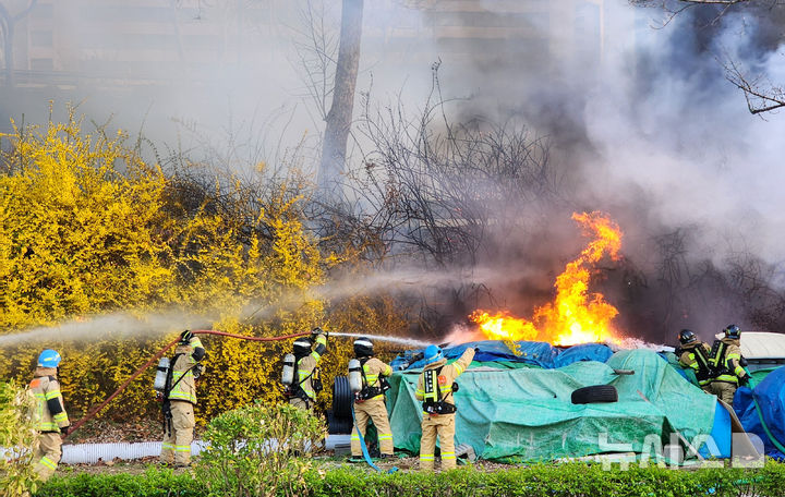 【NEWSIS】5日午後、ソウル市松坡区の蚕室漢江公園・蚕室案内センター付近で火災が発生した。写真は消火にあたる消防隊員たち。