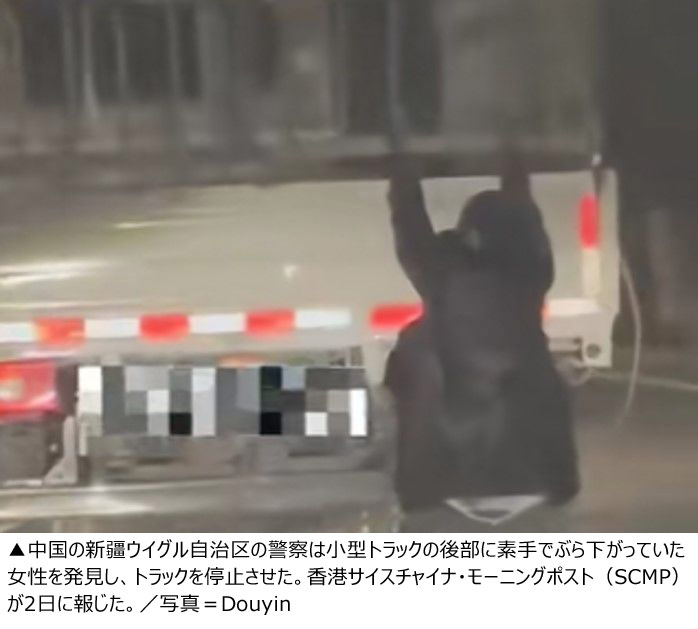 香港紙サウスチャイナ・モーニングポスト(SCMP)が2日に報じた。それによると事件は今年3月末夜に中国新疆ウイグル自治区のある路上で起こった。当時パトロール中だった交通警察は、暗い中を走行する小型トラック後部に正体不明の何かがぶら下がっているのを発見した。接近して確認したところ、一人の女性が素手だけでトラックの荷台に危険な状態でぶら下がっていた。