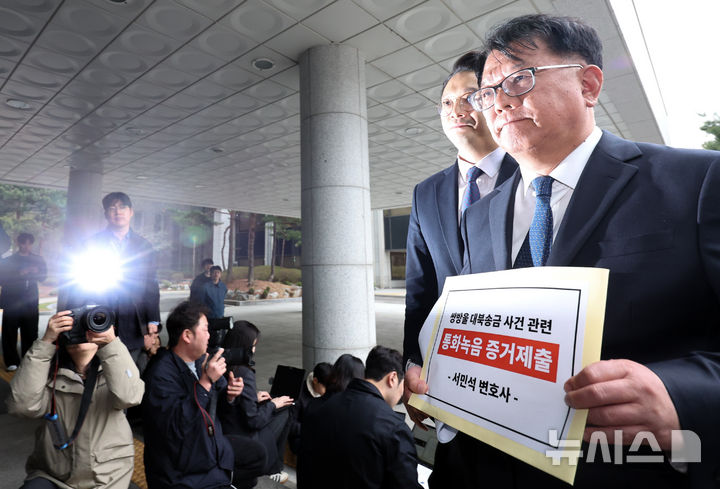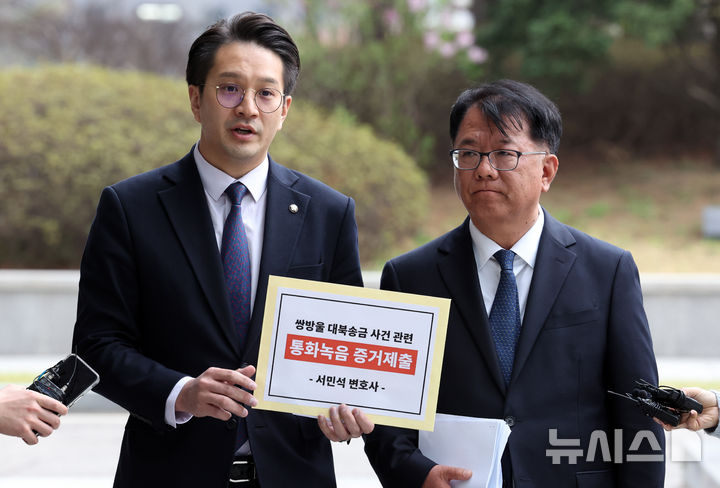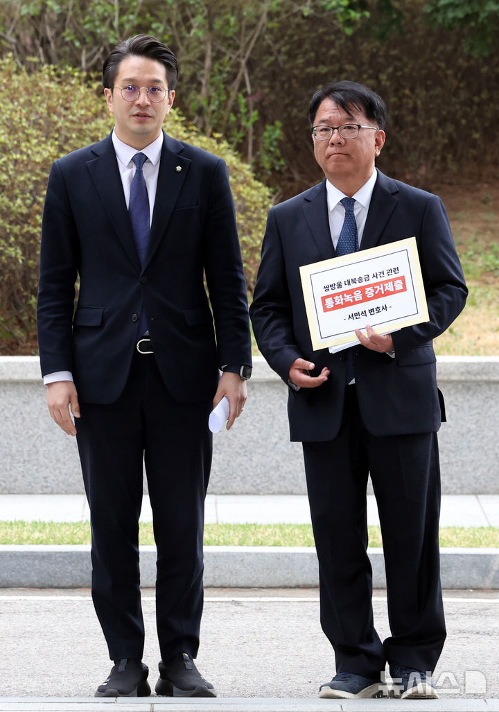 【NEWSIS】韓国与党・共に民主党の田溶冀(チョン・ヨンギ)議員とソ・ミンソク弁護士が6日、ソウル市瑞草区のソウル高等検察庁前で、大手下着メーカー、サンバンウルの対北朝鮮送金事件に関する朴庠勇(パク・サンヨン)検事音声ファイル証拠提出に先立ち、記者会見を開いた。