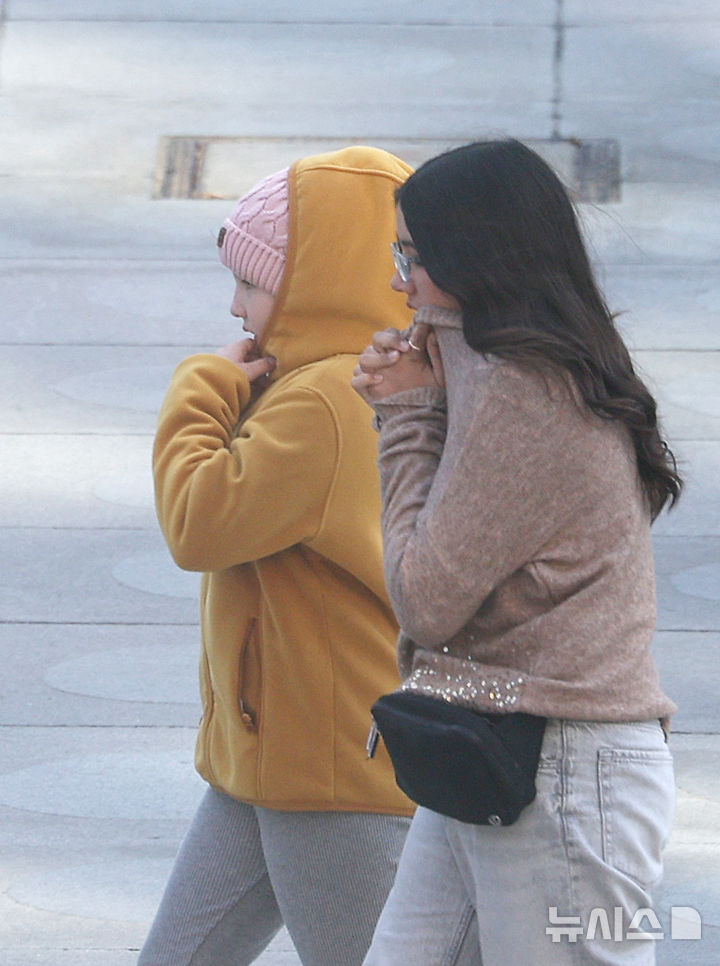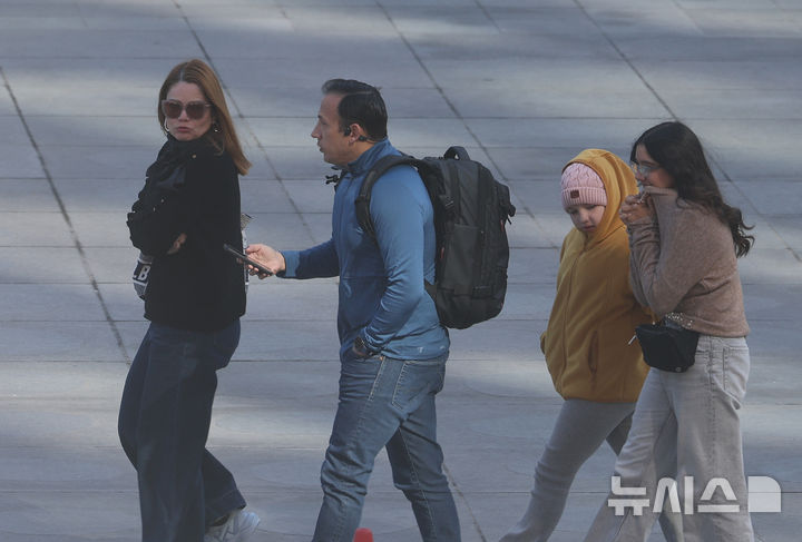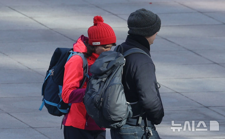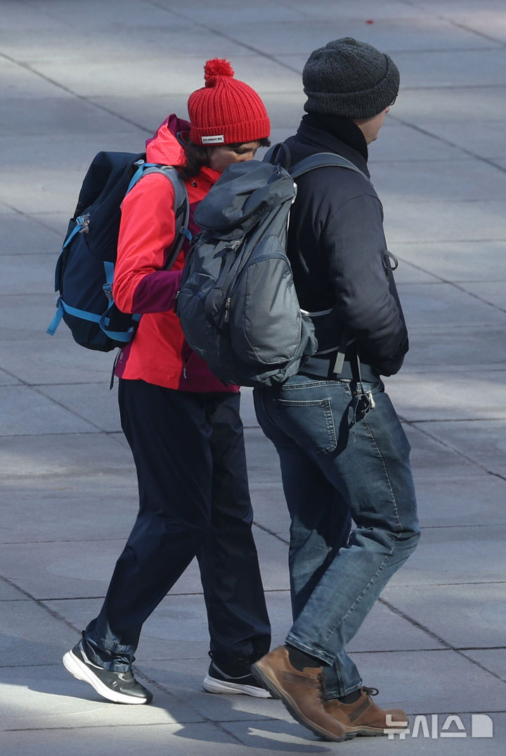 【NEWSIS】花冷えで前日より5℃以上も気温が下がり、最低気温が4℃となった7日朝、ソウル・光化門広場で、コートの襟を立てて歩く外国人観光客たち。