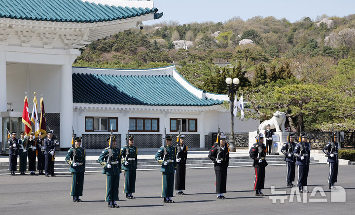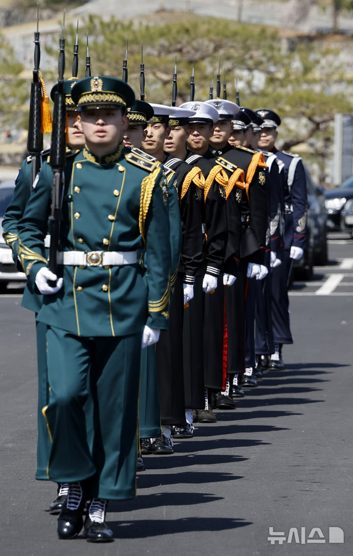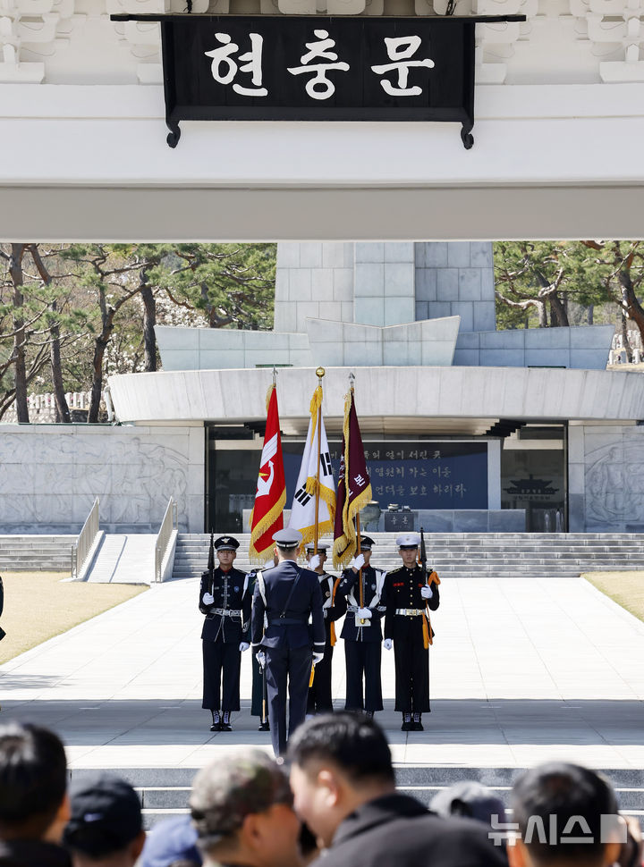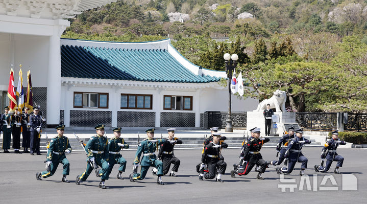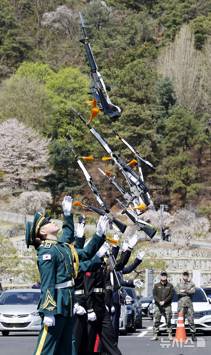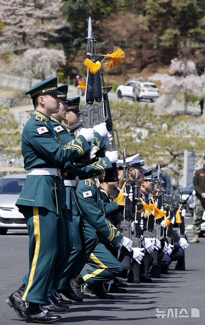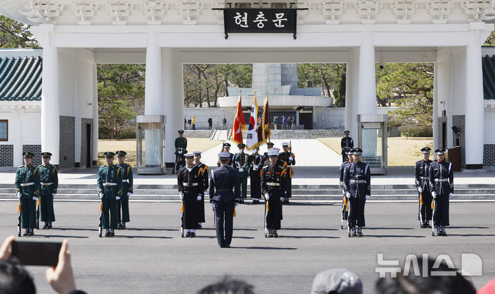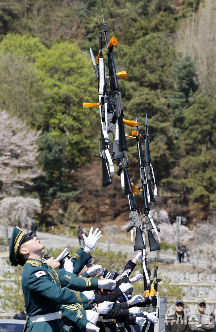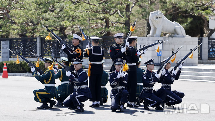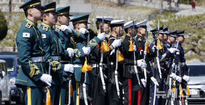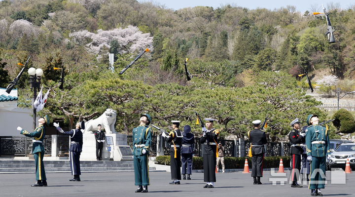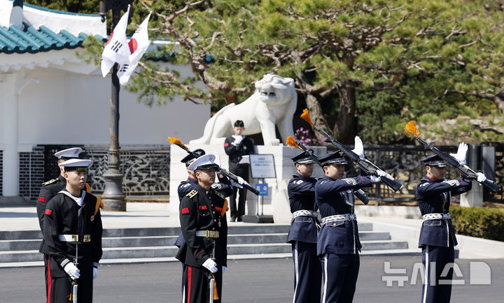 【NEWSIS】7日、ソウル市銅雀区の国立ソウル顕忠院顕忠門前で開かれた「顕忠門定例軍儀仗行事」で、韓国国防部(省に相当)儀仗隊所属の韓国軍将兵が動作展示を行っている様子。