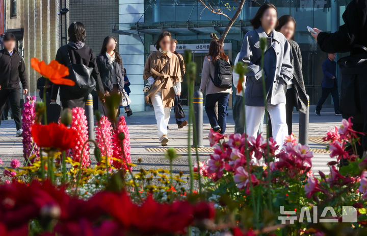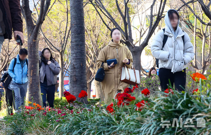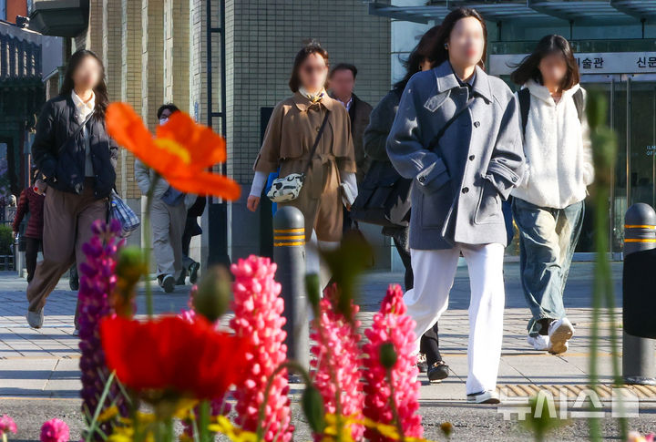 【NEWSIS】ソウルの朝の最低気温が3℃まで下がるなど、全国的に肌寒い天気が続いた8日、ソウル市中区の世宗大路で、冬物のコートを着て歩く人々。