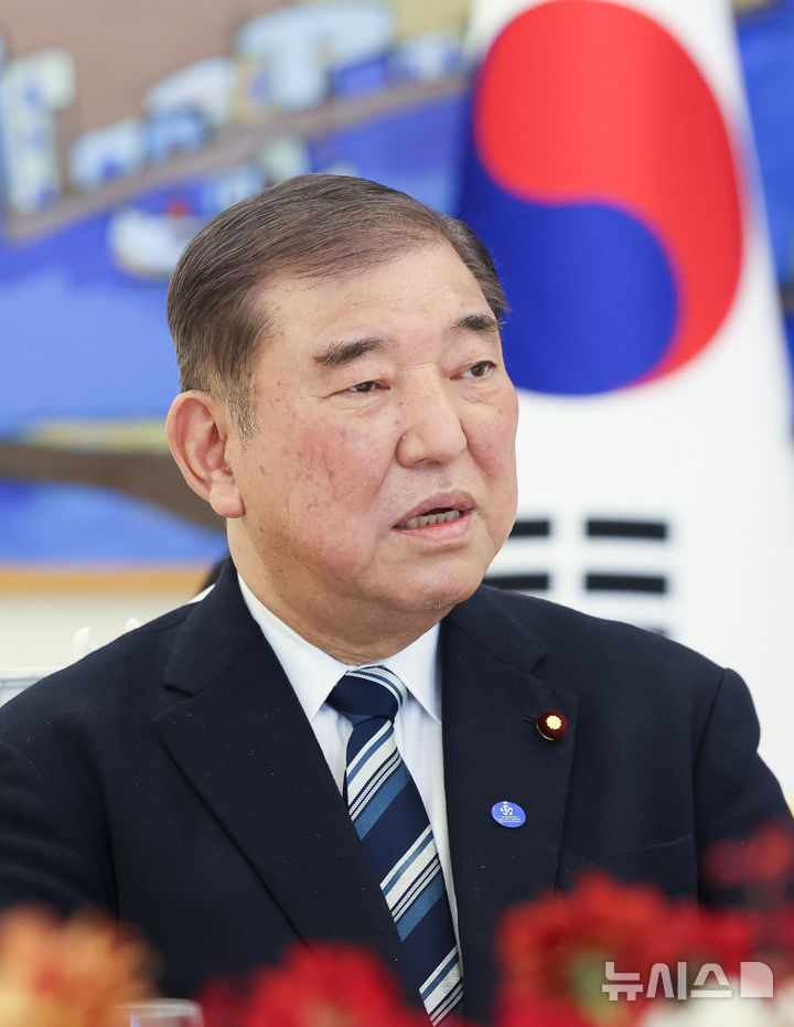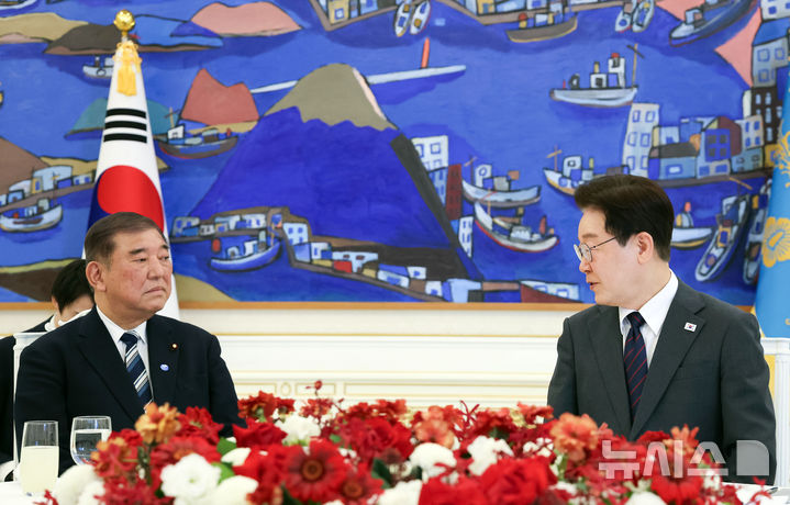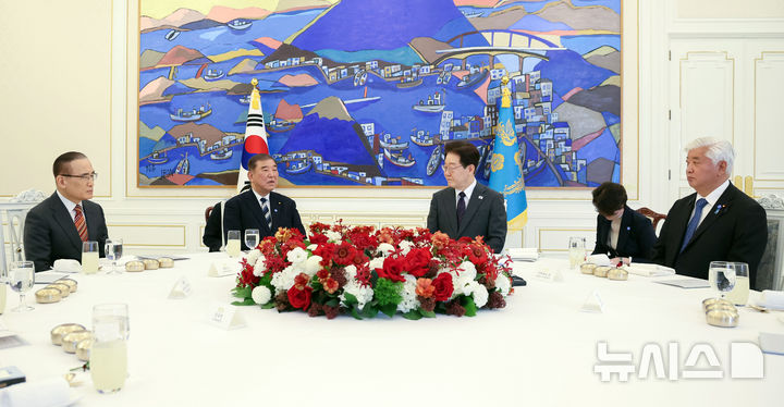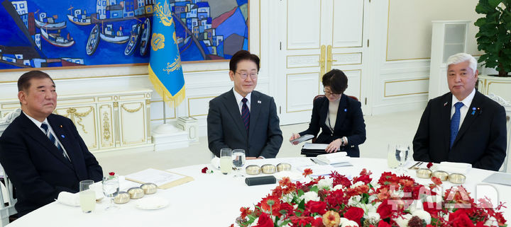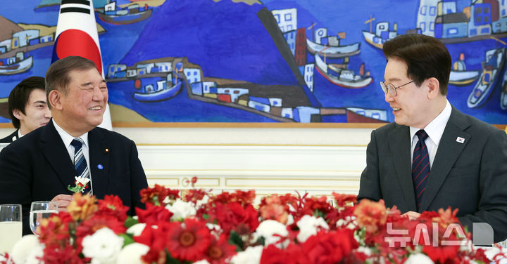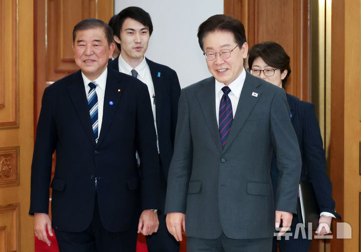 【NEWSIS】韓国の李在明(イ・ジェミョン)大統領が8日、青瓦台(韓国大統領府)で石破茂・前首相との昼食会談を前にあいさつを交わしているところ。