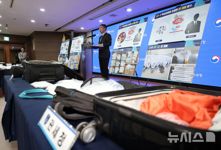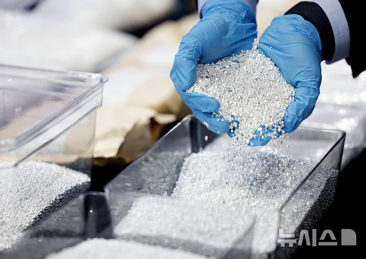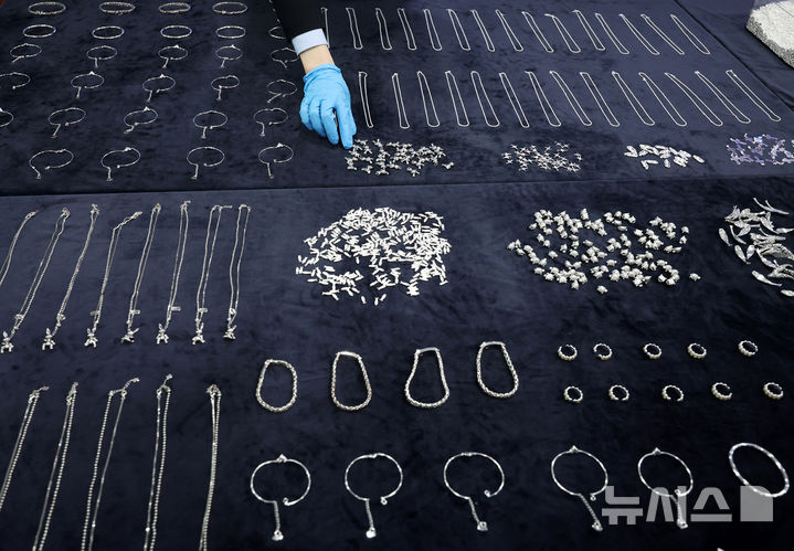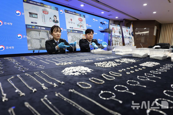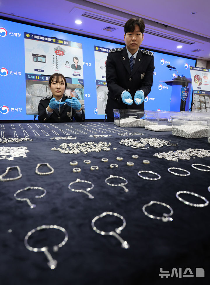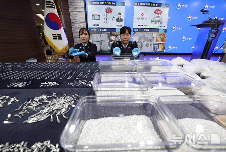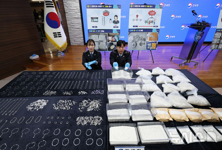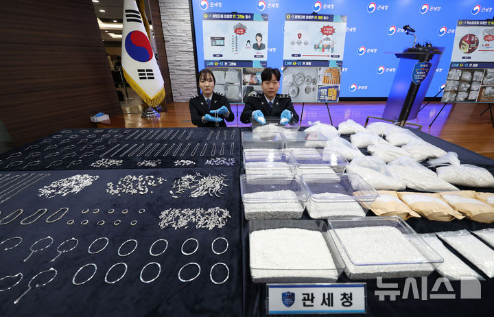 【NEWSIS】韓国関税庁の関係者が8日、仁川市中区の仁川空港税関輸出入通関庁舎大会議室で、摘発した銀密輸事件で押収した銀製品を公開している様子。