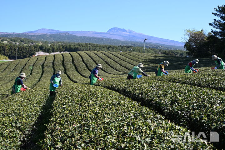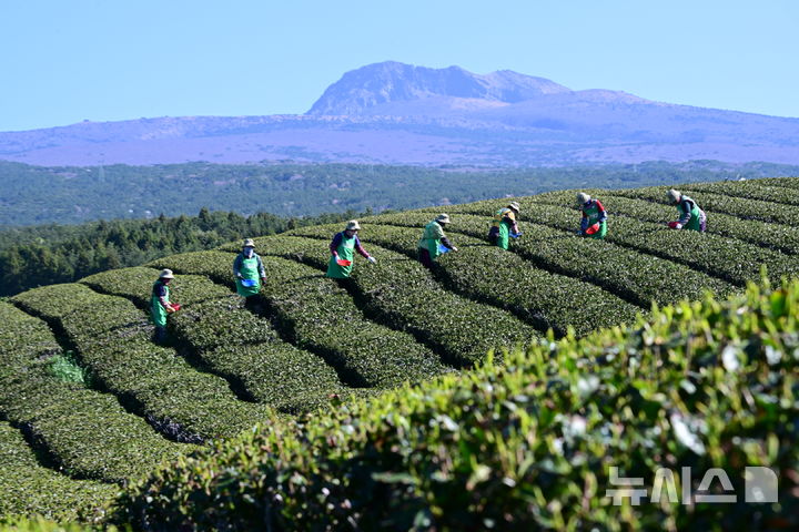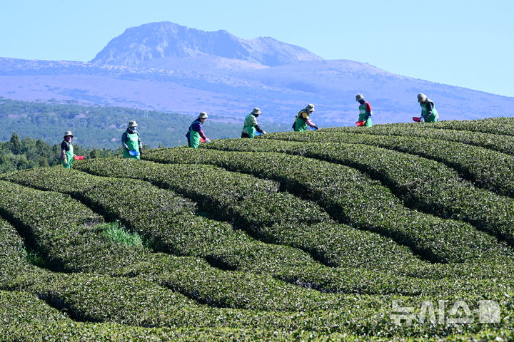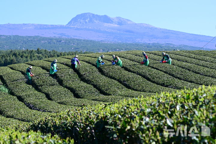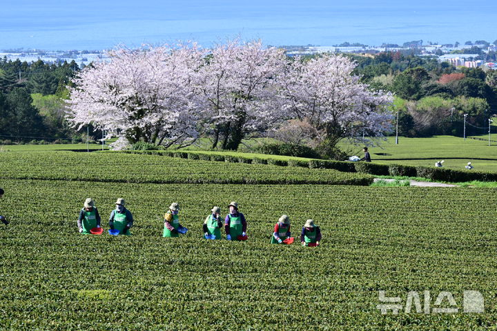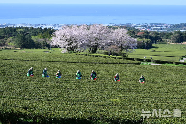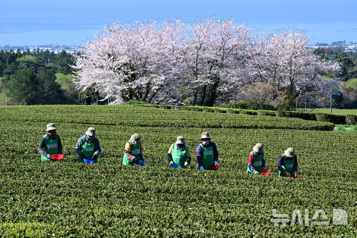 【NEWSIS】うららかな春の天気となった8日午前、済州道西帰浦市道順洞のトルソンイ茶畑では、農業者が新茶(ヘチャ)の収穫作業を行っていた。