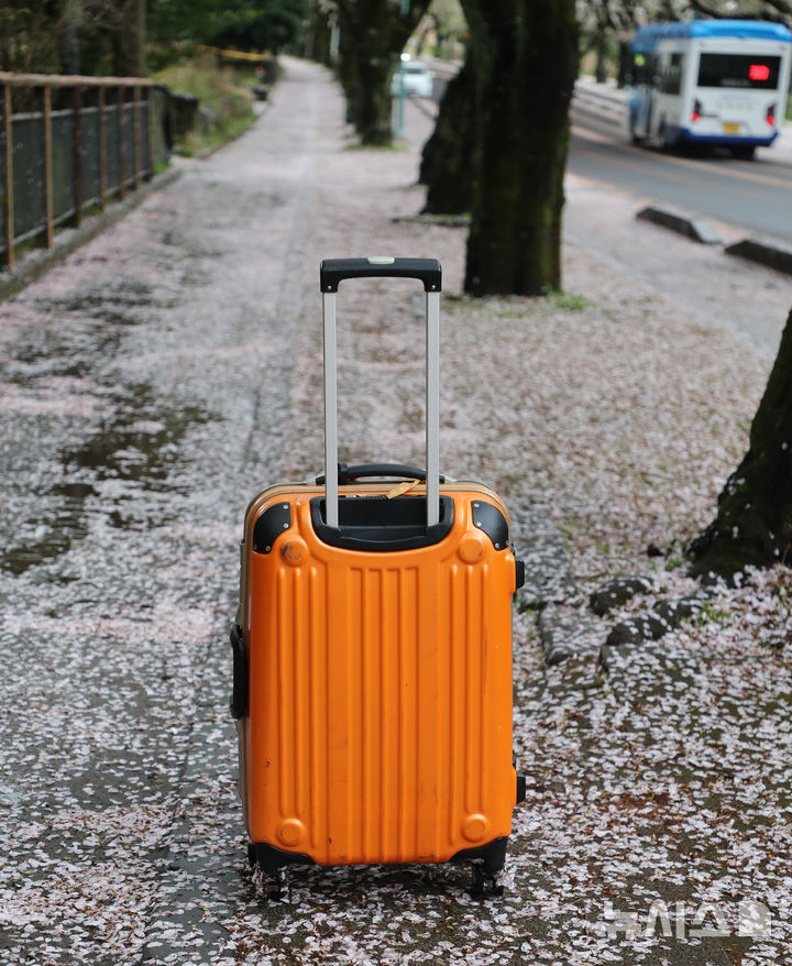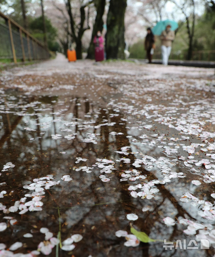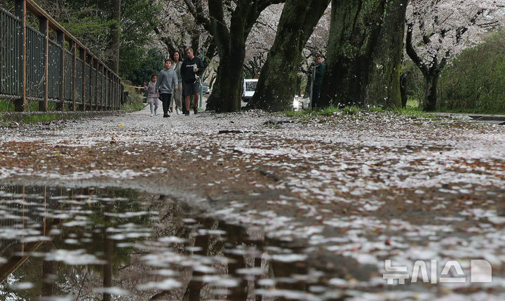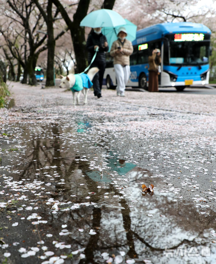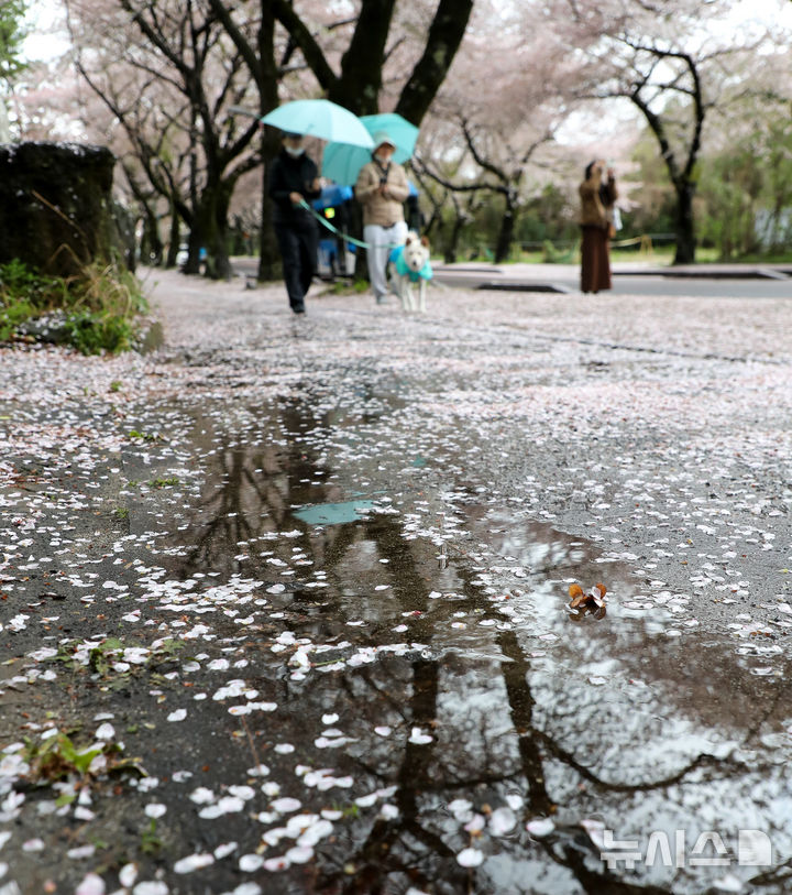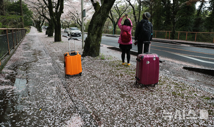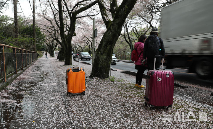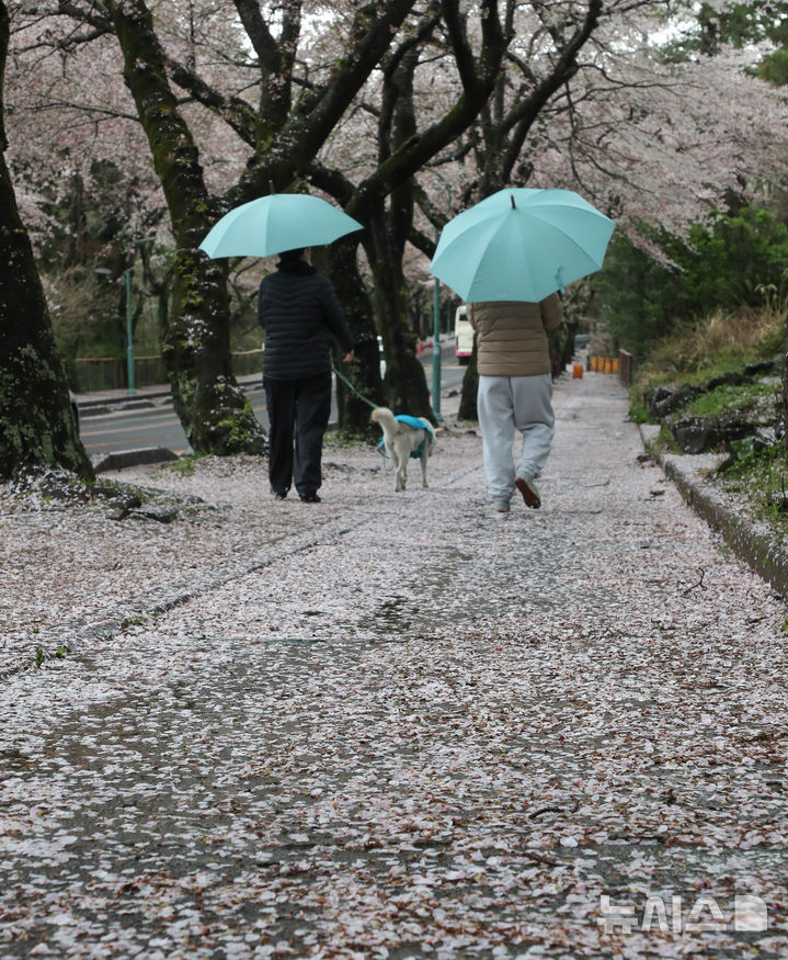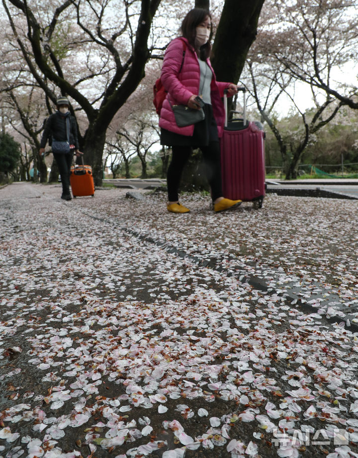 【NEWSIS】どんよりとした空が続く9日午前、済州特別自治道済州市内の済州大学前の桜並木を歩く人々。桜の花びらが雨や風を受けて舞い散っていた。