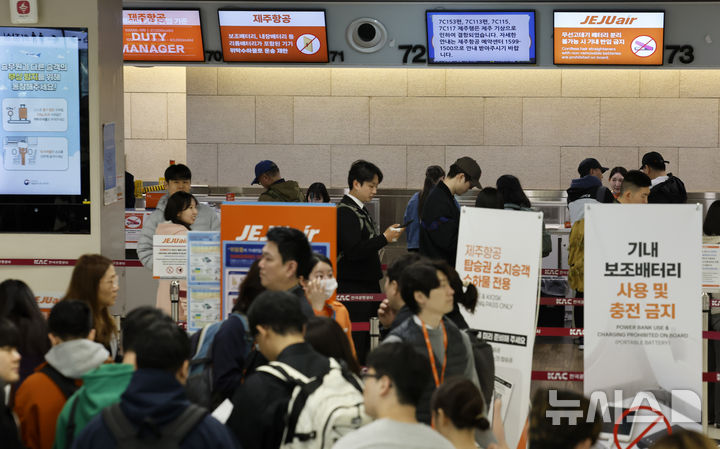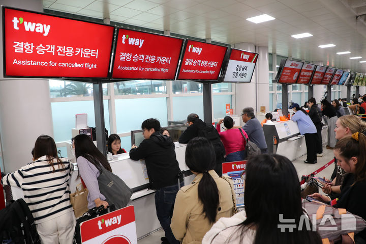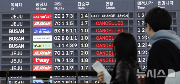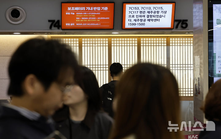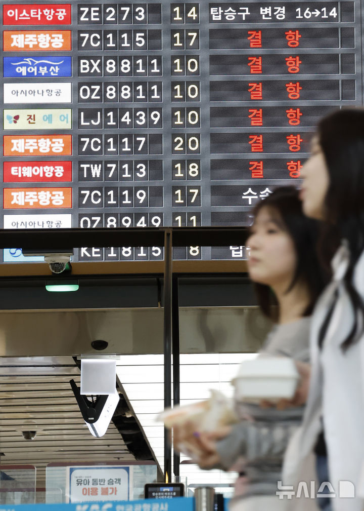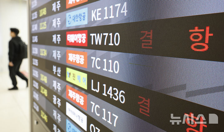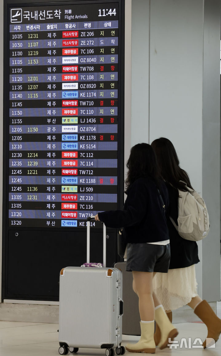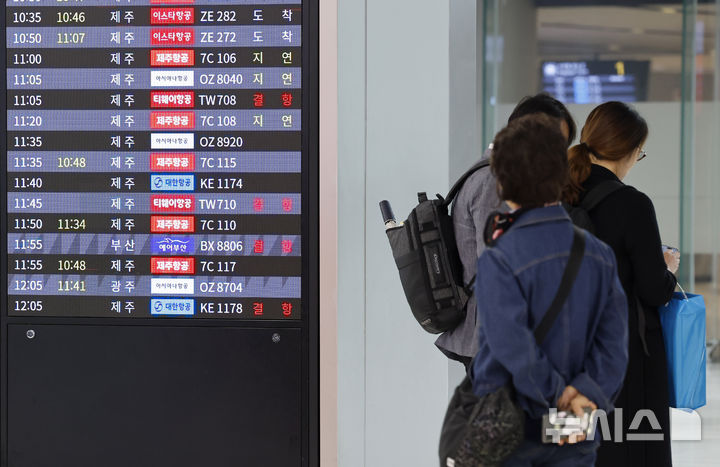 【NEWSIS】9日、済州に強風を伴う大雨が降り、済州とその他の地域を往復する航空機の運航が遅延している。ソウル市江西区の金浦空港国内線庁舎の電光掲示板に表示された済州地方の案内の様子。