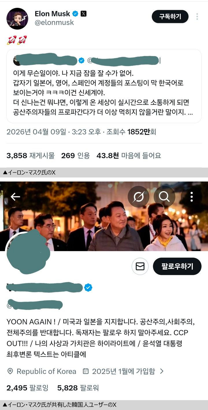 このポスティングはマスク氏のXを通じて一瞬で拡散し、投稿から1日で1850万アクセスを突破するなど大きな話題となっている。ところが韓国では同時に懸念の声が出始めた。投稿者が尹錫悦(ユン・ソンニョル)前大統領らを擁護する「ユン・アゲイン」活動のためにSNS(交流サイト)を利用する人物だったからだ。世界的影響力を持つマスク氏が特定の政治的考えを持つユーザーのメッセージをそのまま伝えたことで、本人の意向とは関係なく韓国で政治的に大きな問題となった形だ。