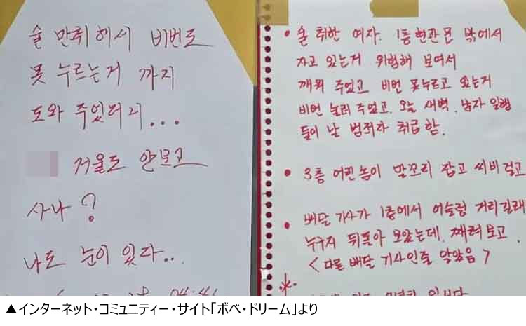ネット・コミュニティー・サイト「ボベ・ドリーム」に9日、「変態と誤解されたある入居者の警告文」というタイトルの投稿があり、写真が掲載された。